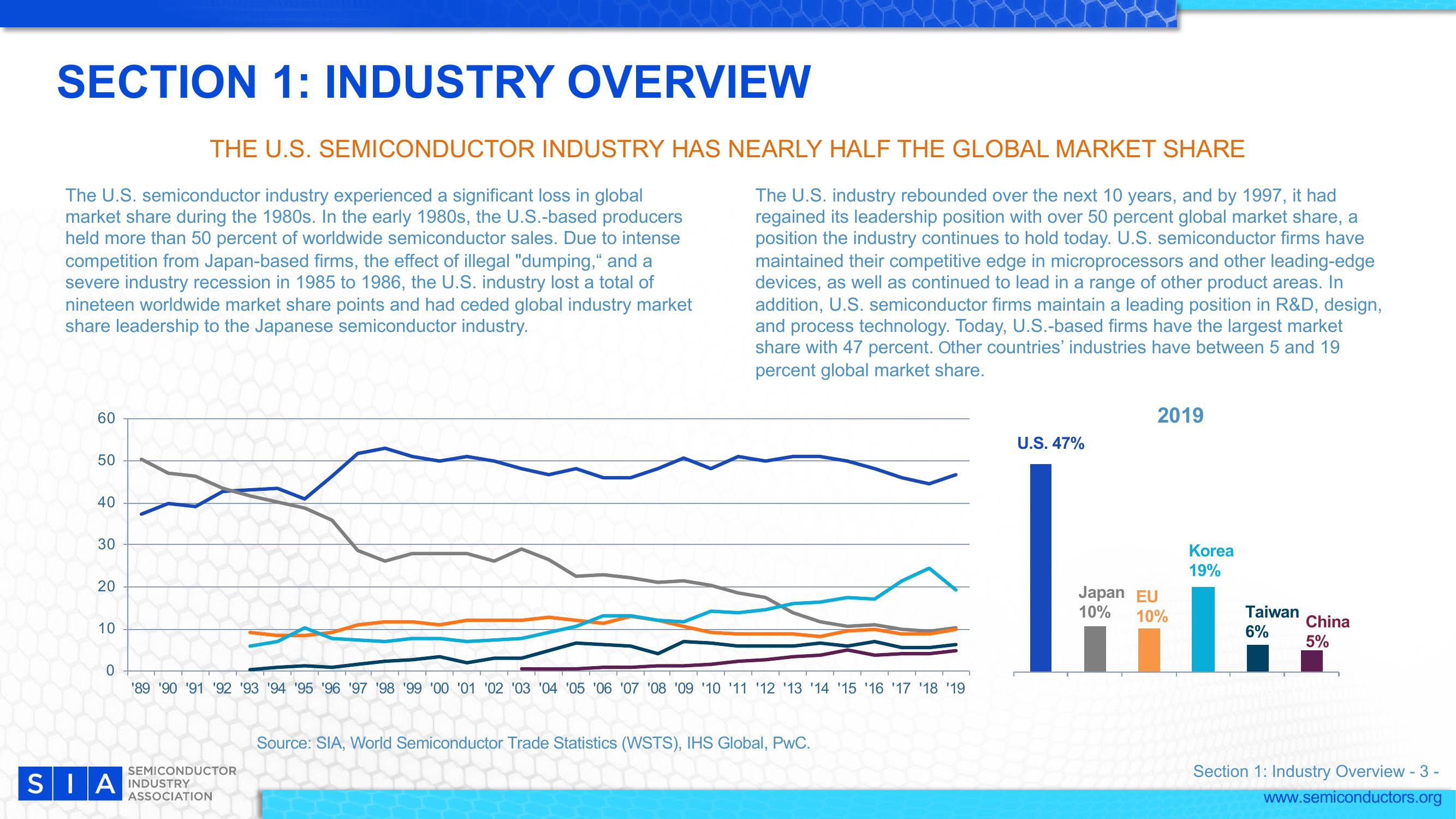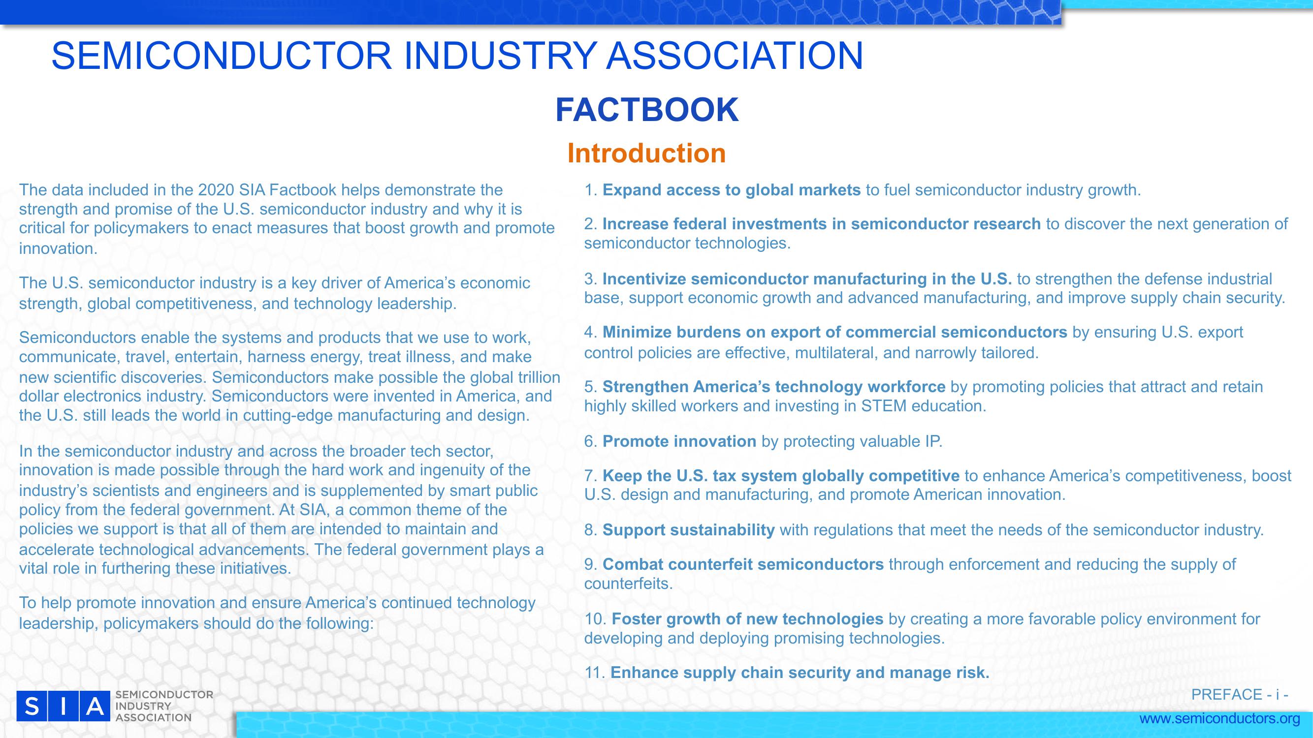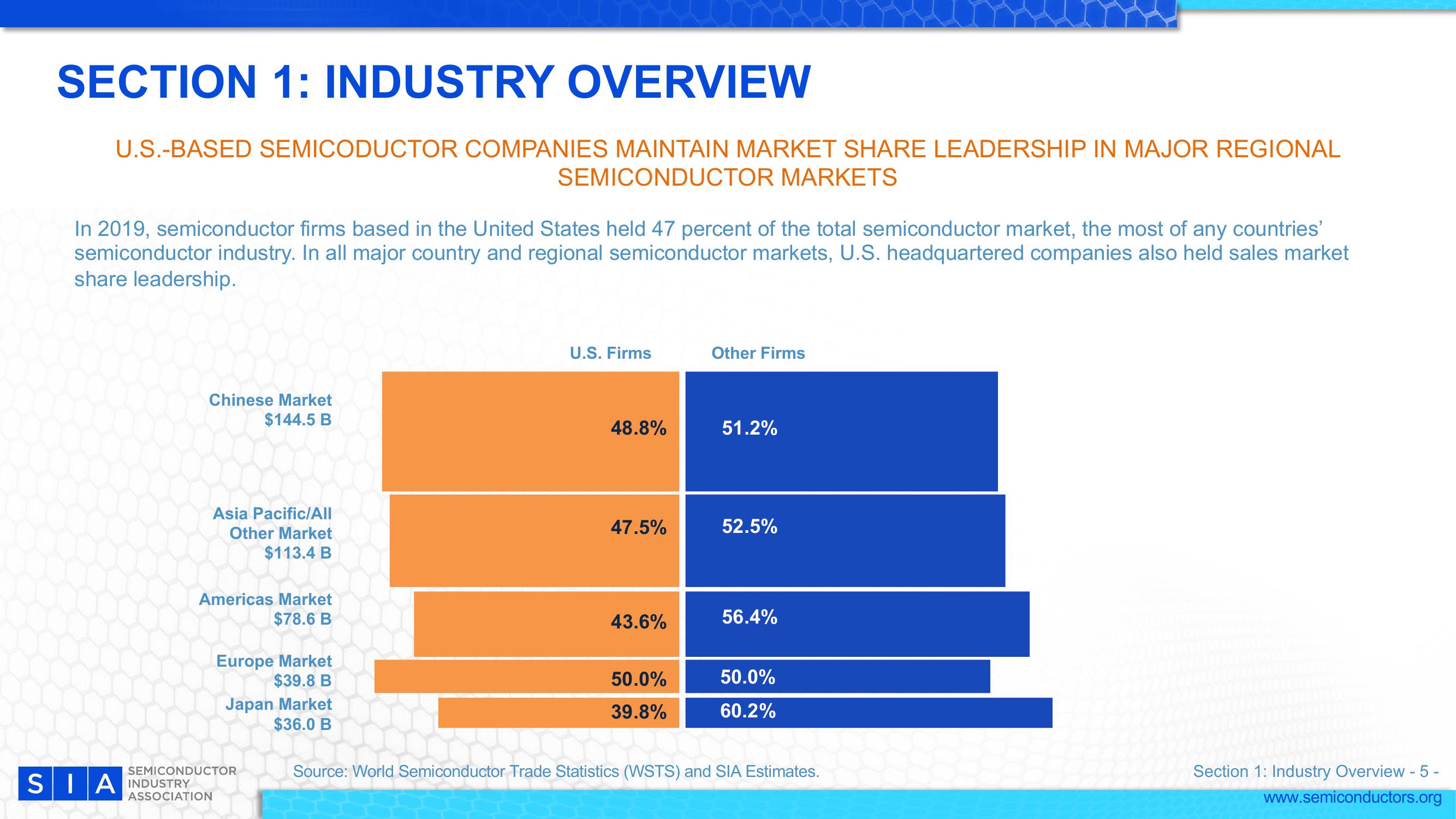美国半导体产业协会(SEMICONDUCTOR INDUSTRY ASSOCIATION,以下简称:SIA)近日发布了《2020年美国半导体产业概况》报告,以翔实数据展现了当前美国半导体产业整体情况。