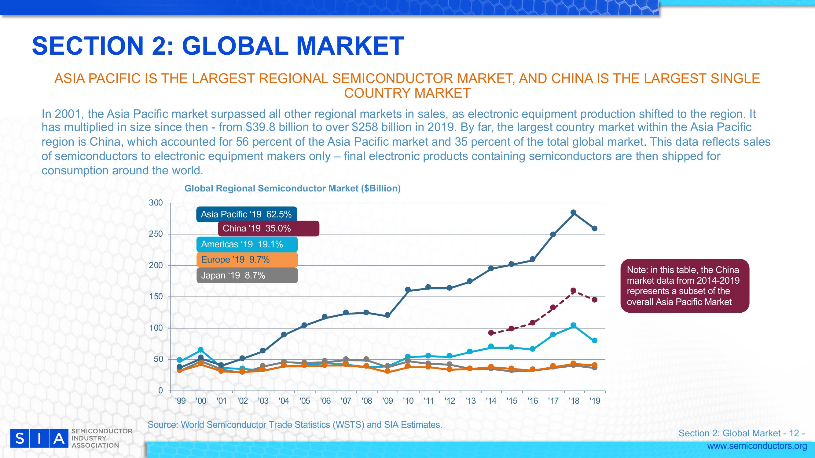 3、亚太地区最大的国家半导体市场是中国,占亚太市场的56%,占全球市场的35%。