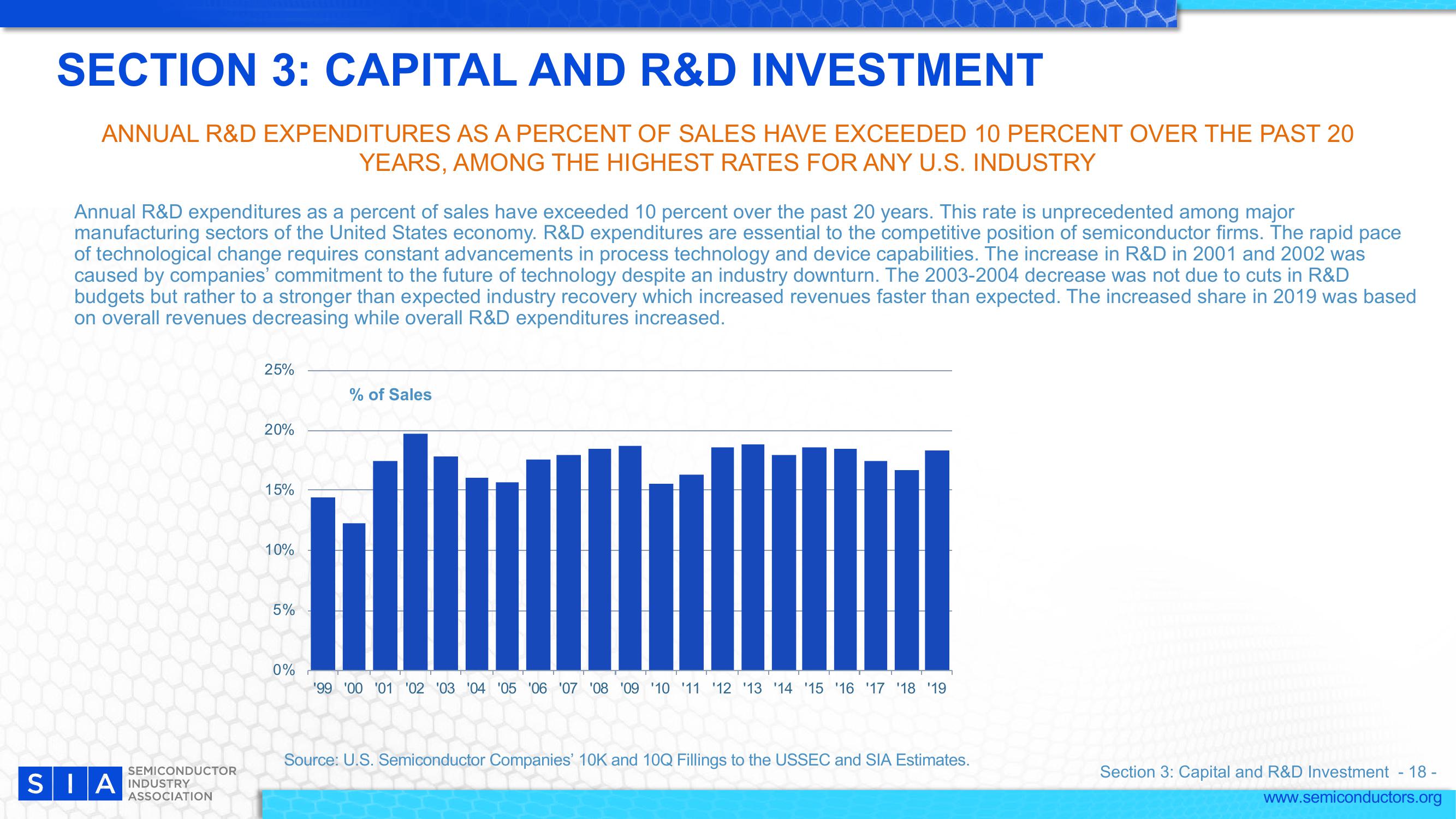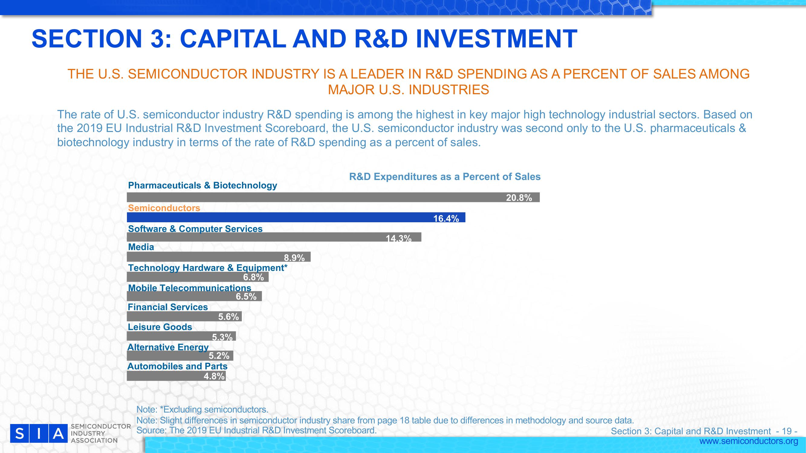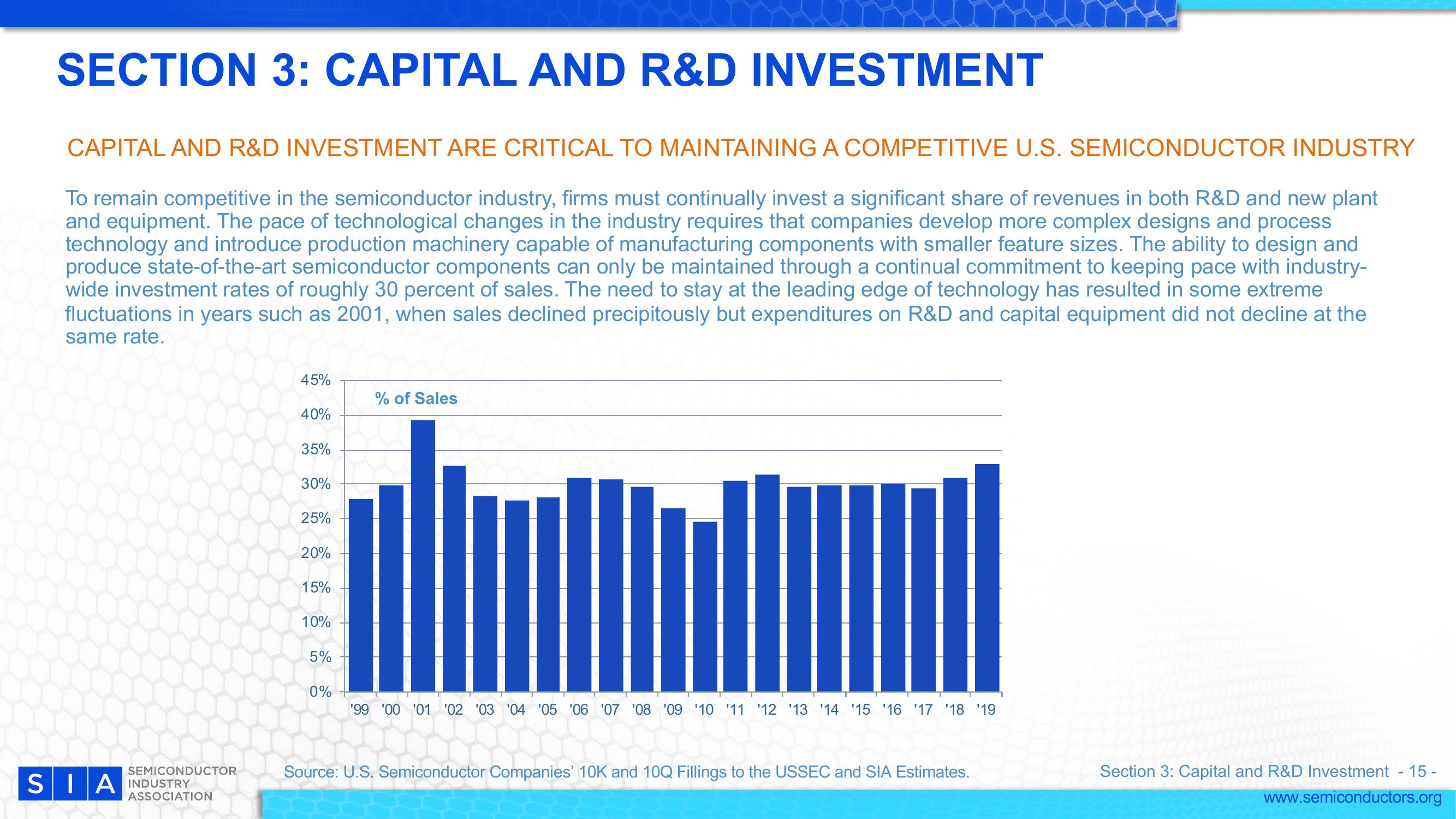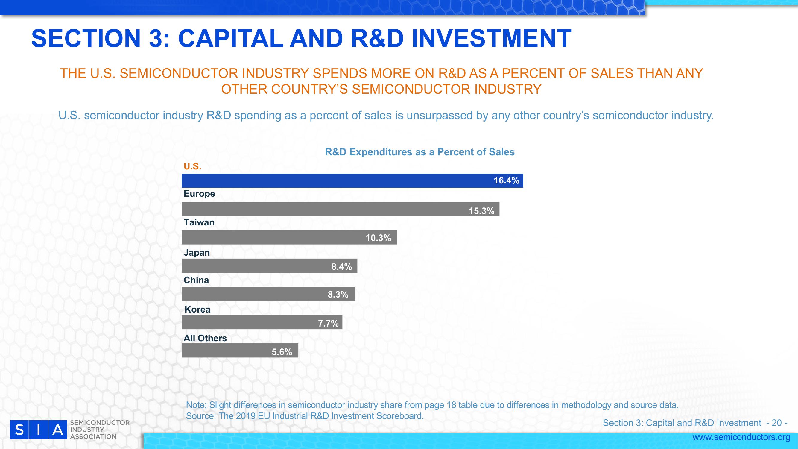 4、研发支出对半导体公司的竞争地位至关重要。在过去的20年里,美国年度研发支出占销售额的百分比已经超过了10%。这一比例远高于其它国家和地区。