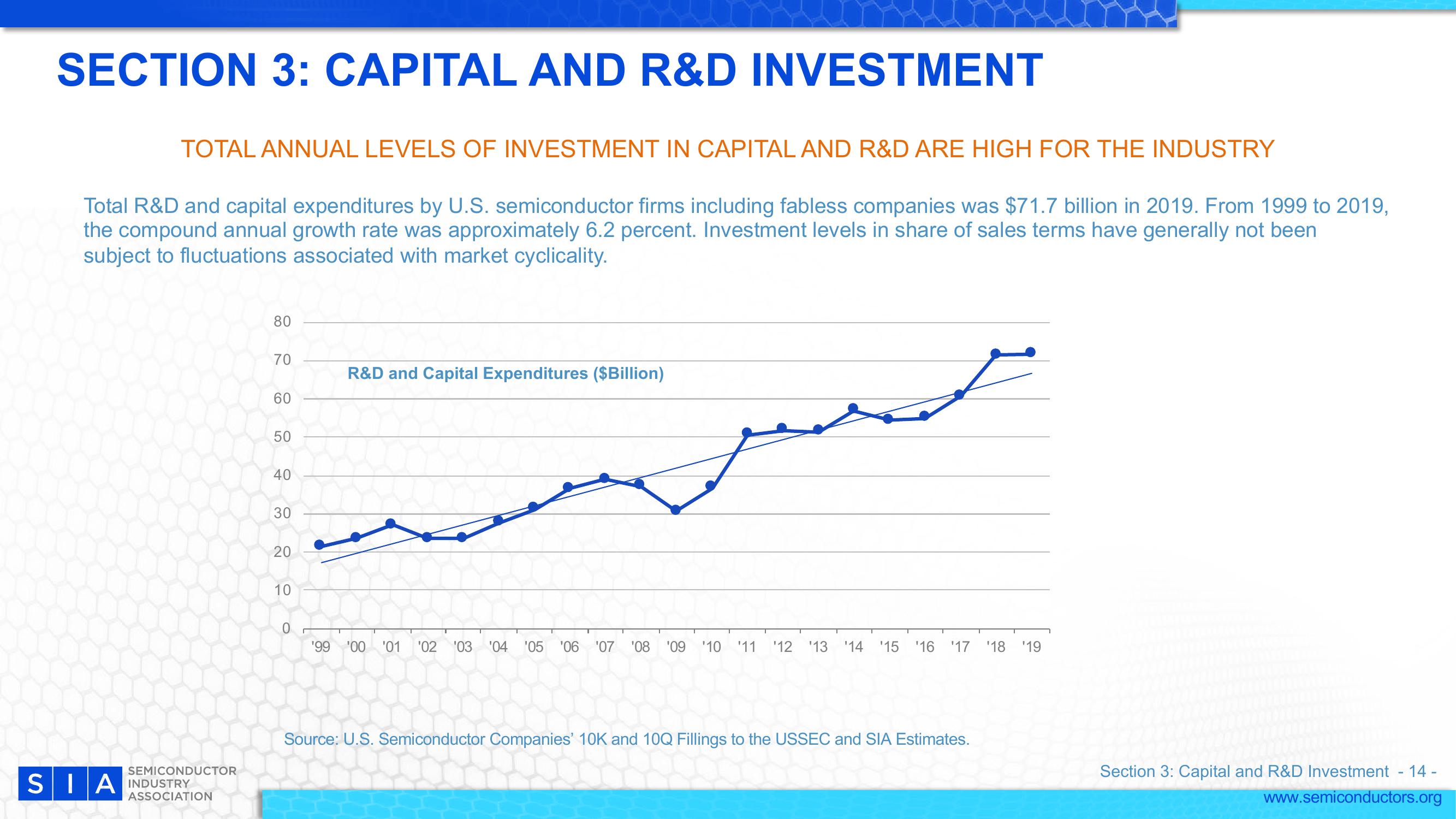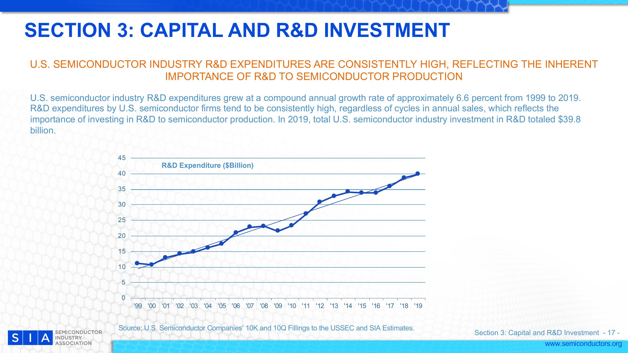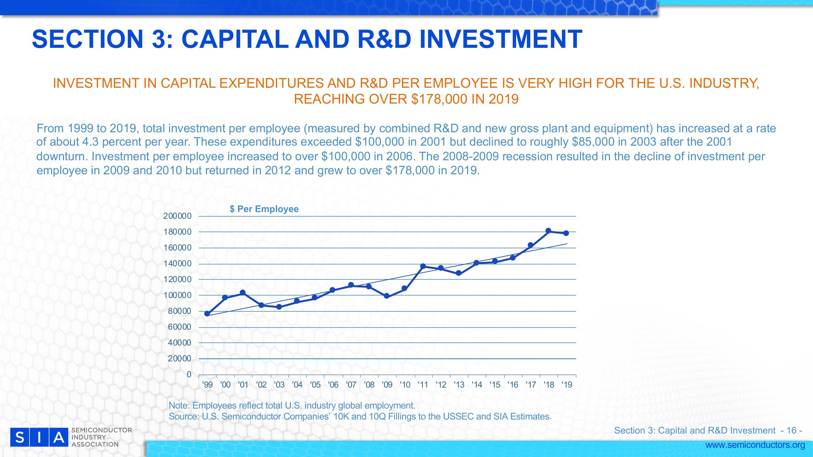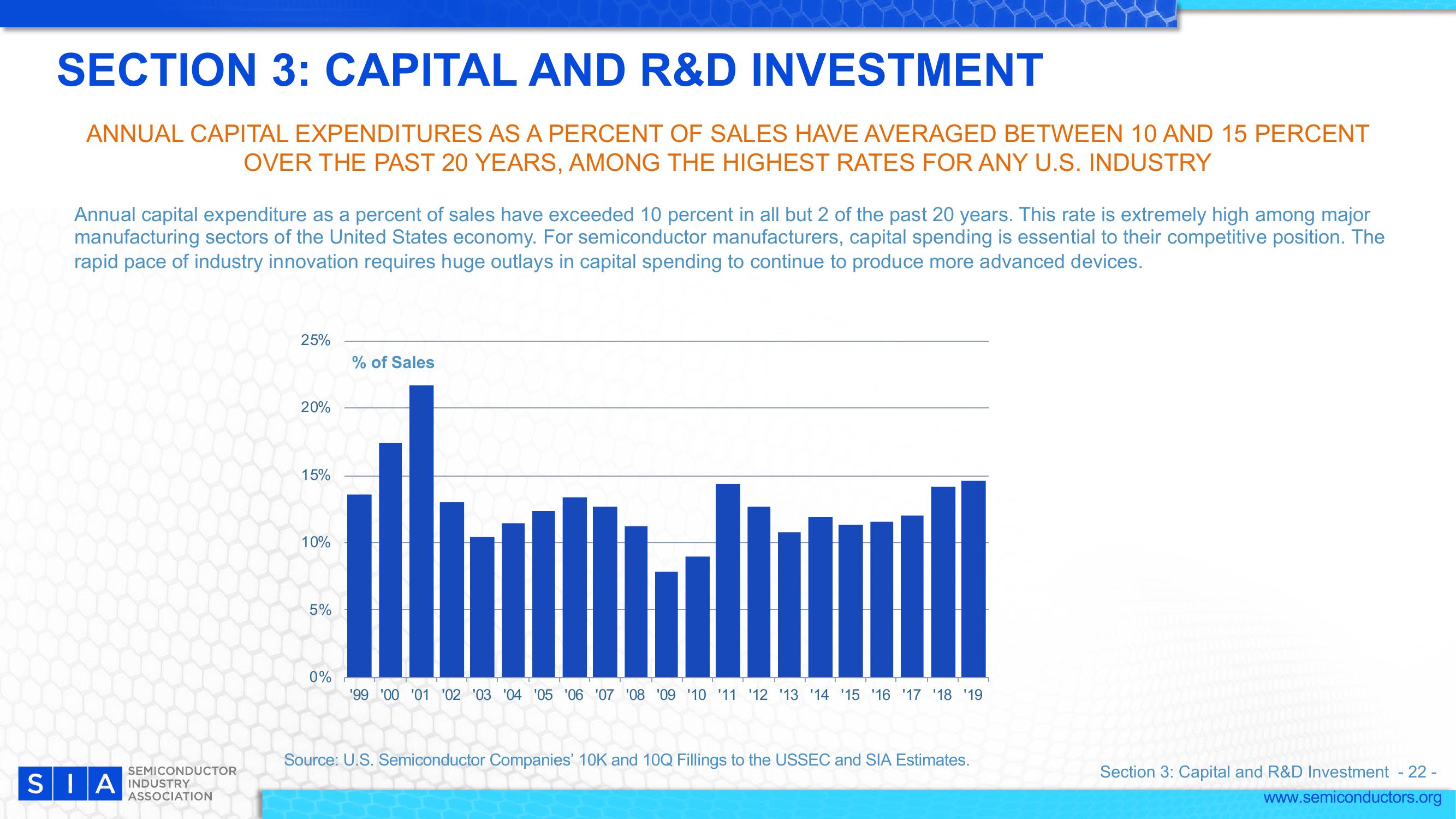4、研发支出对半导体公司的竞争地位至关重要。在过去的20年里,美国年度研发支出占销售额的百分比已经超过了10%。这一比例远高于其它国家和地区。