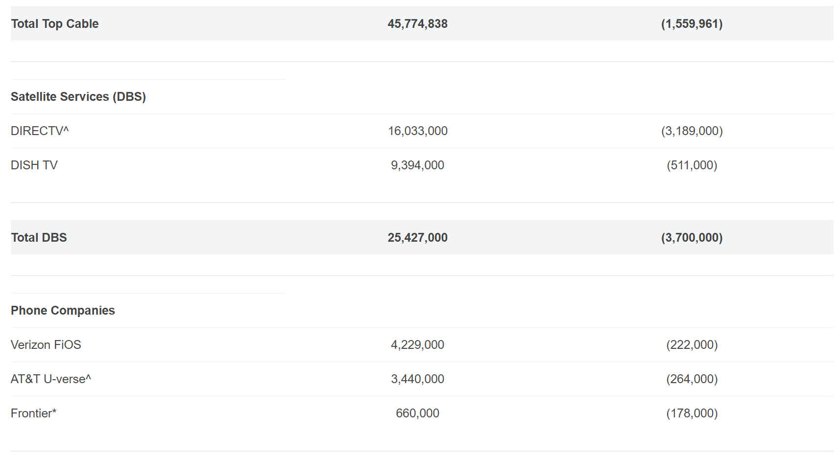 最大的付费电视提供商拥有8620万订户,其中前七大有线电视公司拥有4580万视频订户,卫星电视服务拥有2540万订户,最大的电话公司拥有830万订户,前三名互联网交付(vMVPD)付费电视服务的订户为670万。