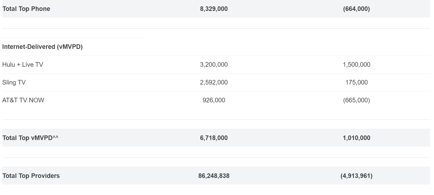 最大互联网交付(vMVPD)服务(Hulu+Live TV、Sling TV和AT&T TV Now)在2019年增加了约101万用户,2018年净增加约194万用户。