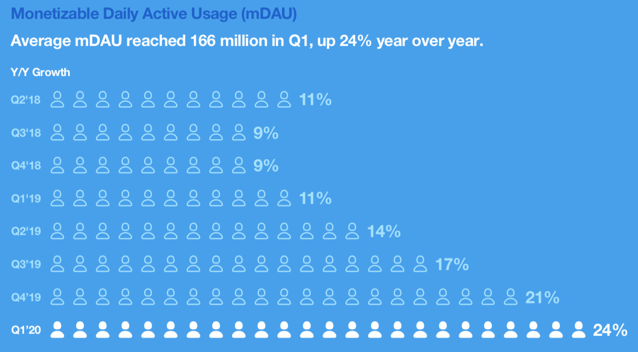 受季节因素、产品改进和人们讨论新冠疫情的影响,1Q20 Twitter可货币化mdau同比增长24%,季度净增1400万用户至1.66亿人。前10大市场DAU同比增长两位数以上,美国市场DAU增长17%,国际市场DAU增长26%。