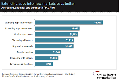 - 相比那些只开发自己想用的应用的开发者,做过市场调查(与用户交流、监控应用商店、雇人做调查)的开发者收入更高,是前者的两倍。