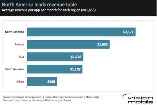 - 平均来看,亚洲开发者开发的应用更多,涉及的平台更多,但收入较低。其原因是:在亚洲多数地区,收费应用不受欢迎,因此亚洲开发者多依赖广告收入,这是最差的盈利模式。