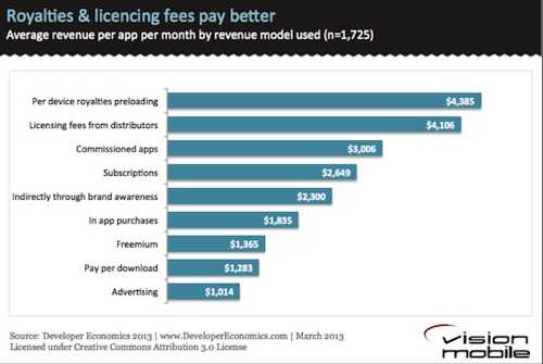 - 设备特许使用费和授权许可费是最赚钱的模式,但是它们的门槛太高,多数开发者无法采用。