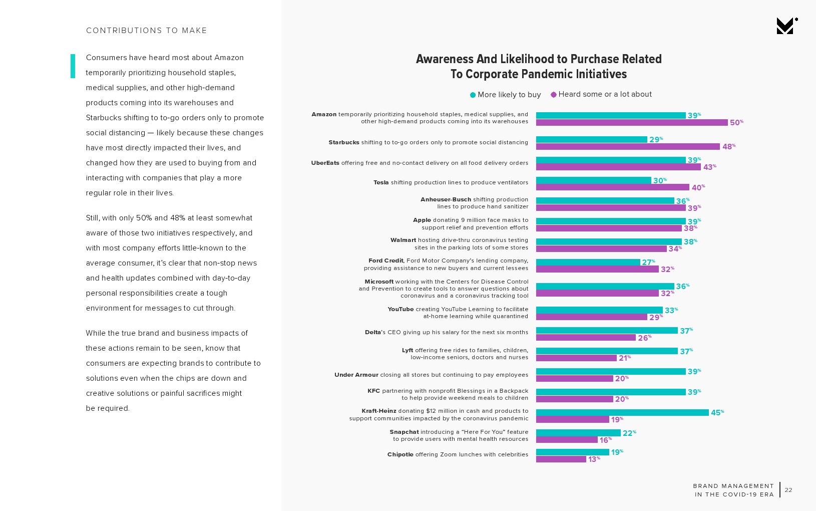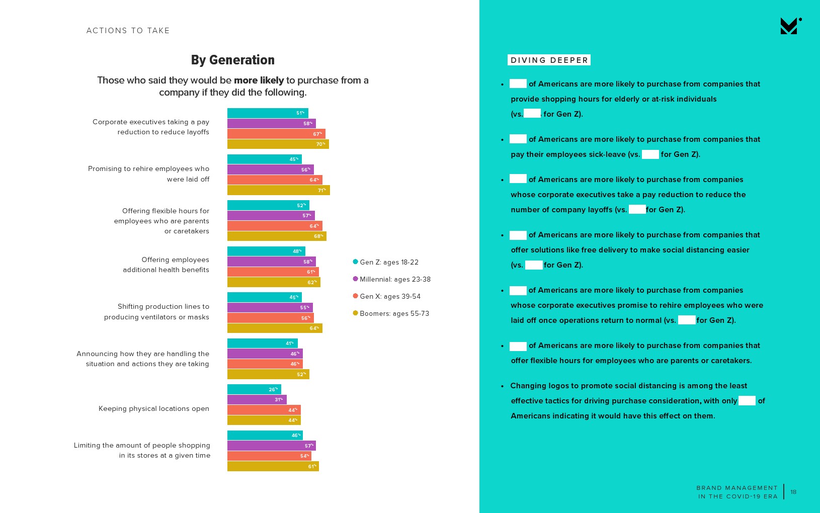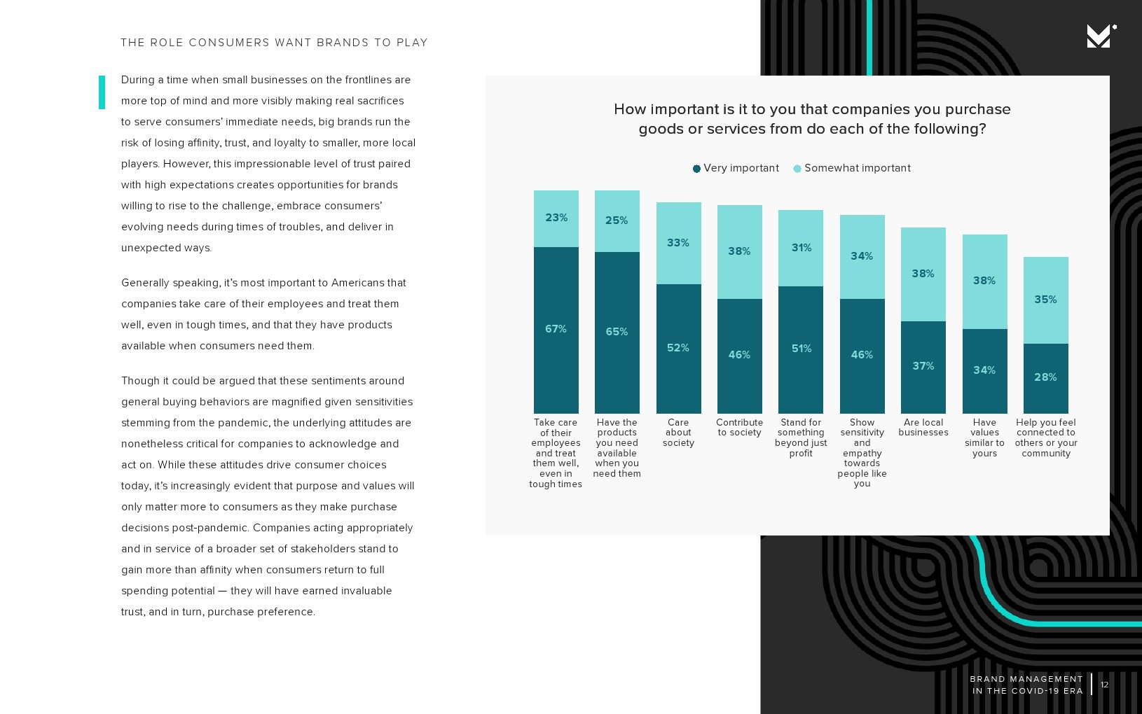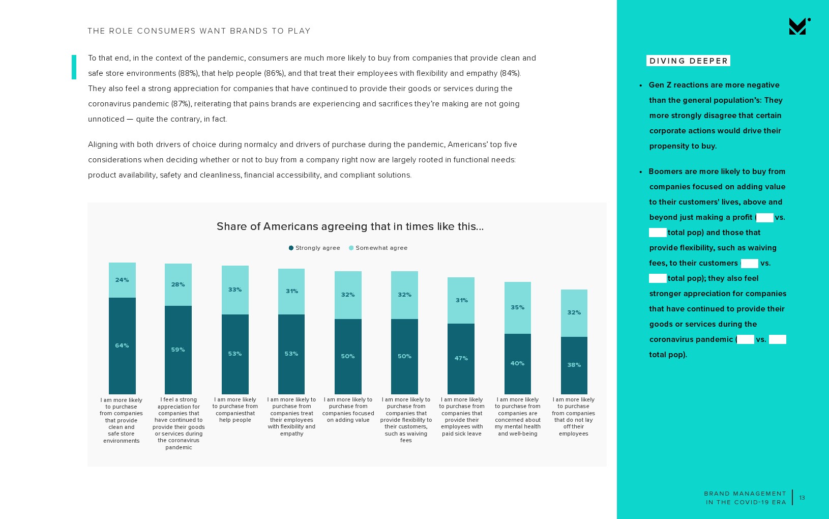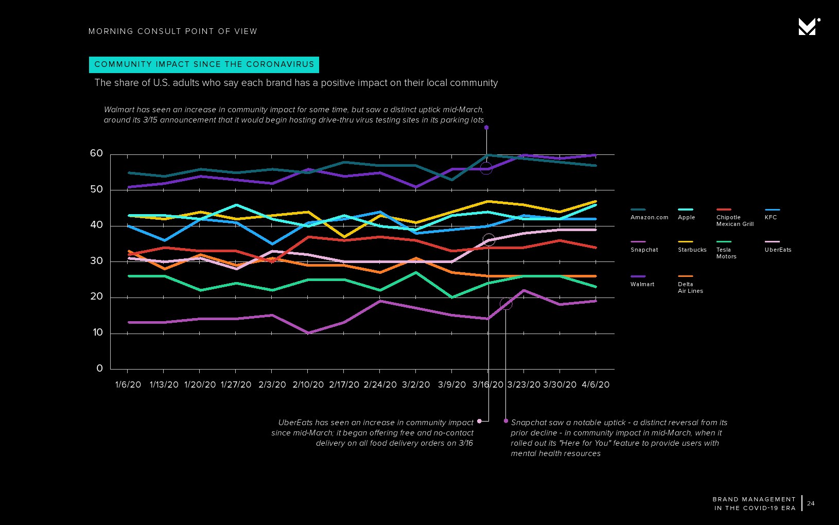Morning Consult发布了新报告“渡过难关—病毒流行期间的品牌管理”。一般来说,大多数美国人更信任有目标的公司。这一点现在比以往任何时候都更重要。研究显示,9/10的消费者表示,即使在艰难时期更可能从照顾员工的品牌购买产品;其他人则表示,公司关心社会(85%),为社会做出贡献(84%),并支持利润以外的东西(82%)很重要。