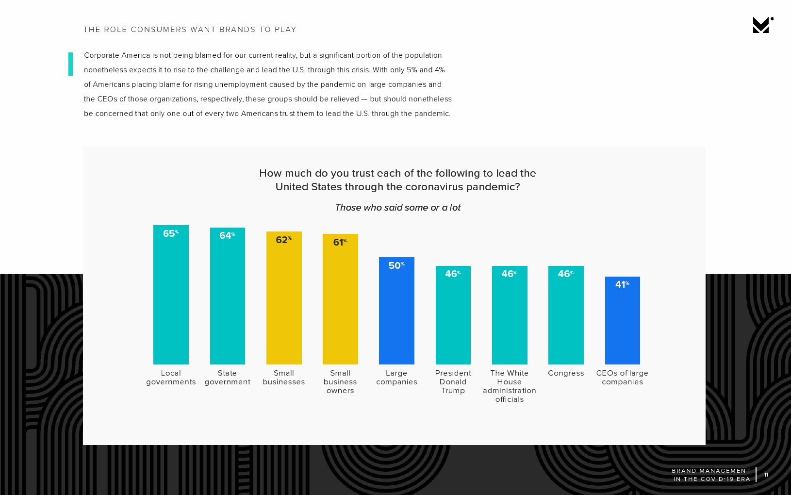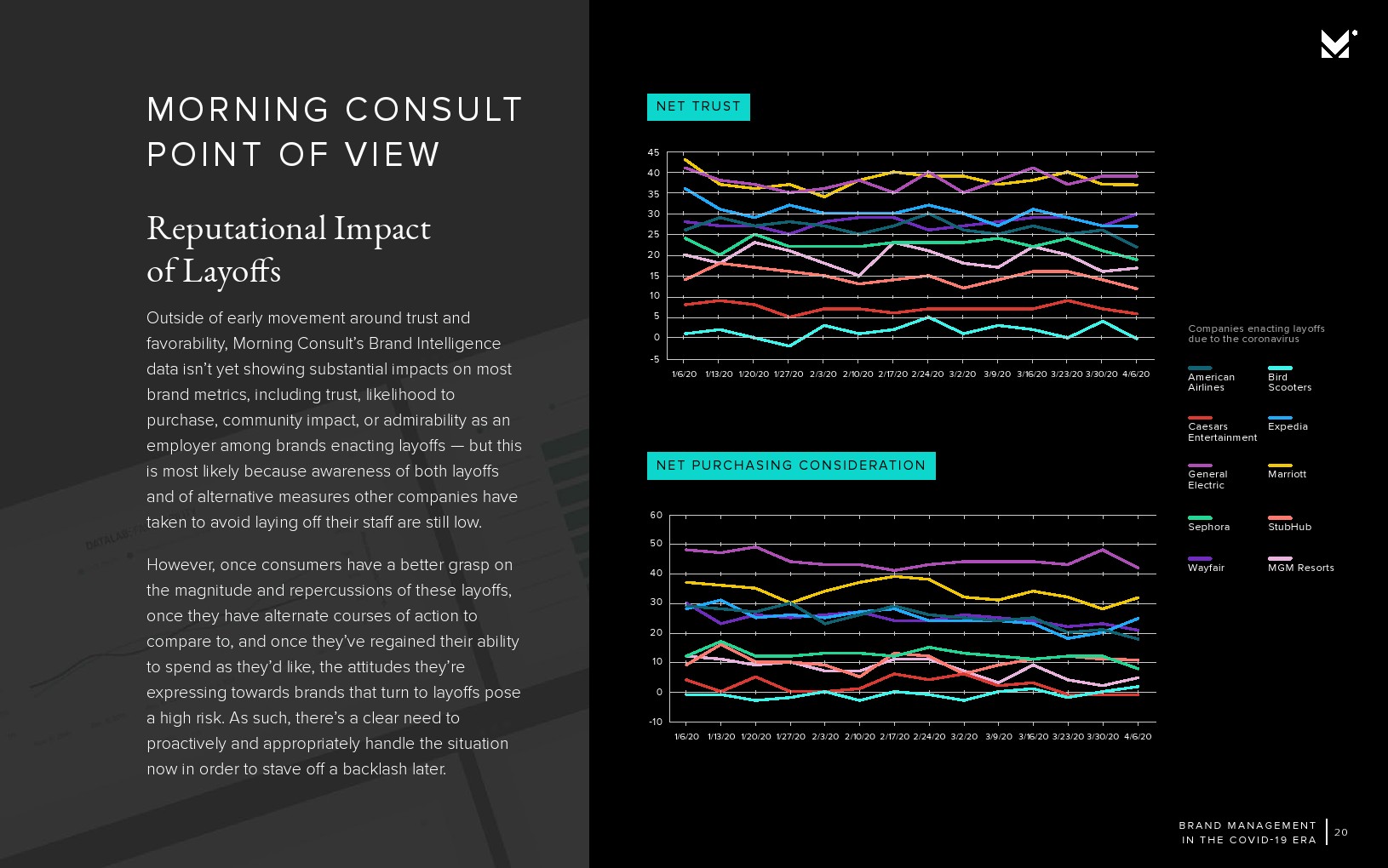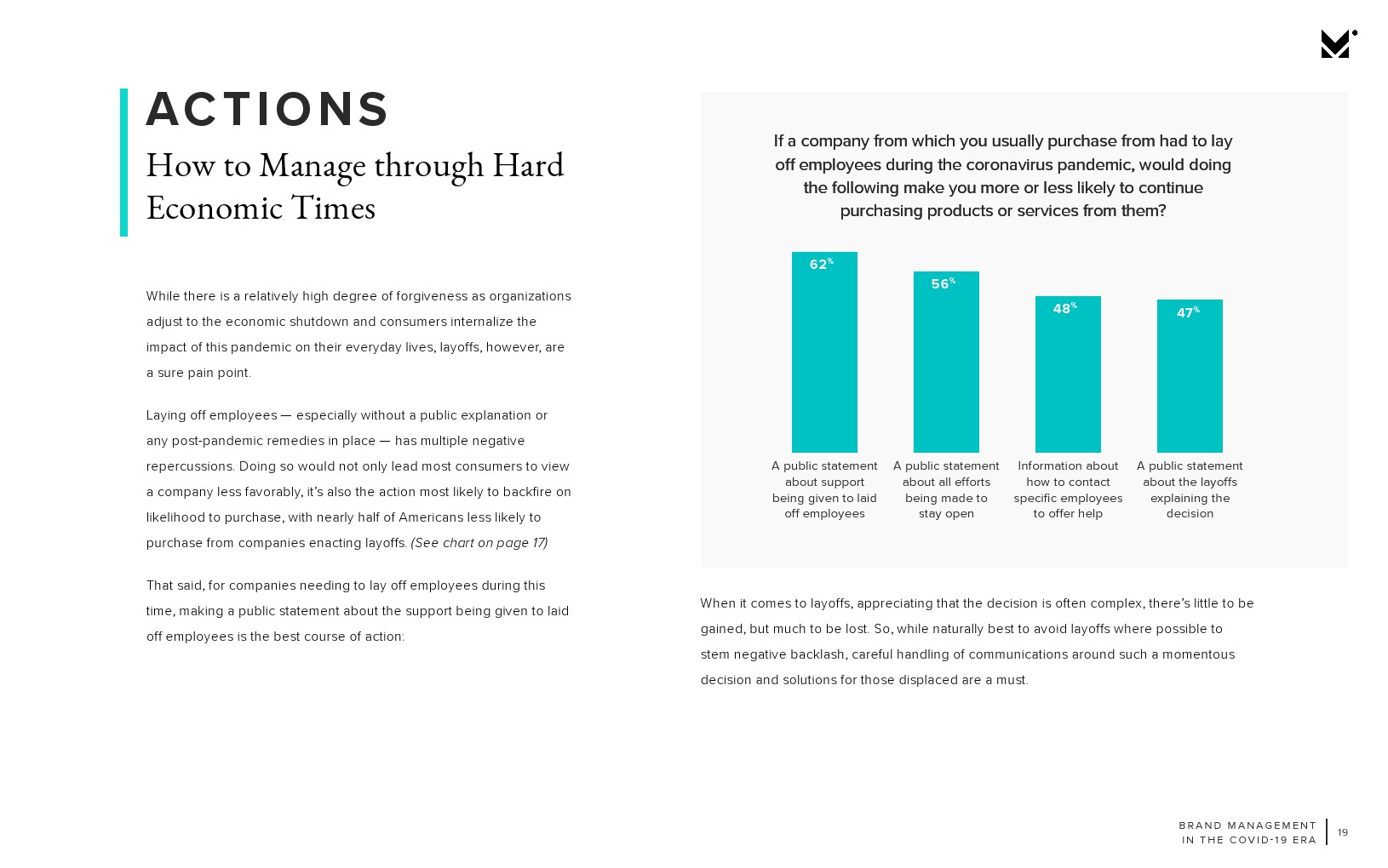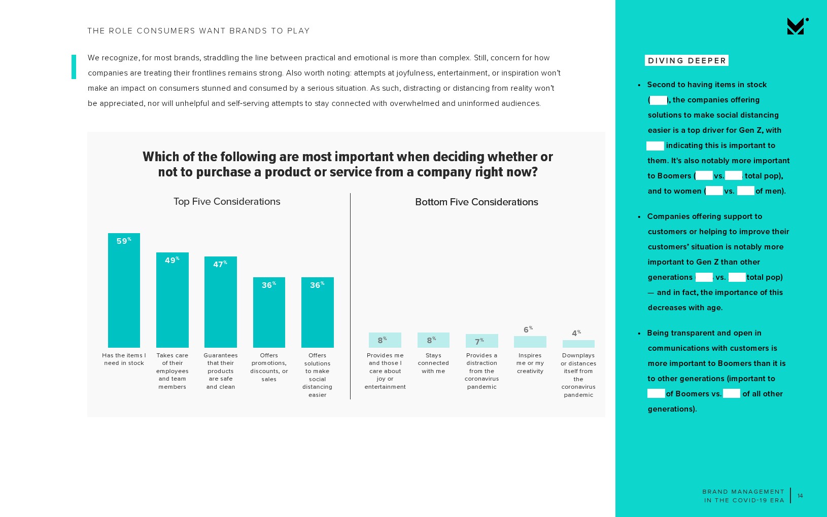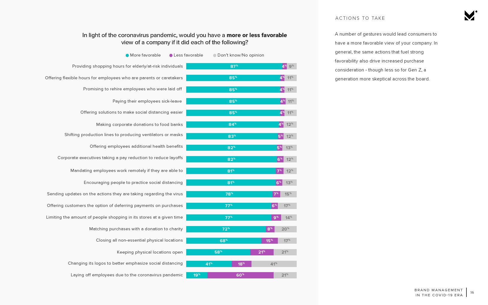 Morning Consult发布了新报告“渡过难关—病毒流行期间的品牌管理”。一般来说,大多数美国人更信任有目标的公司。这一点现在比以往任何时候都更重要。研究显示,9/10的消费者表示,即使在艰难时期更可能从照顾员工的品牌购买产品;其他人则表示,公司关心社会(85%),为社会做出贡献(84%),并支持利润以外的东西(82%)很重要。