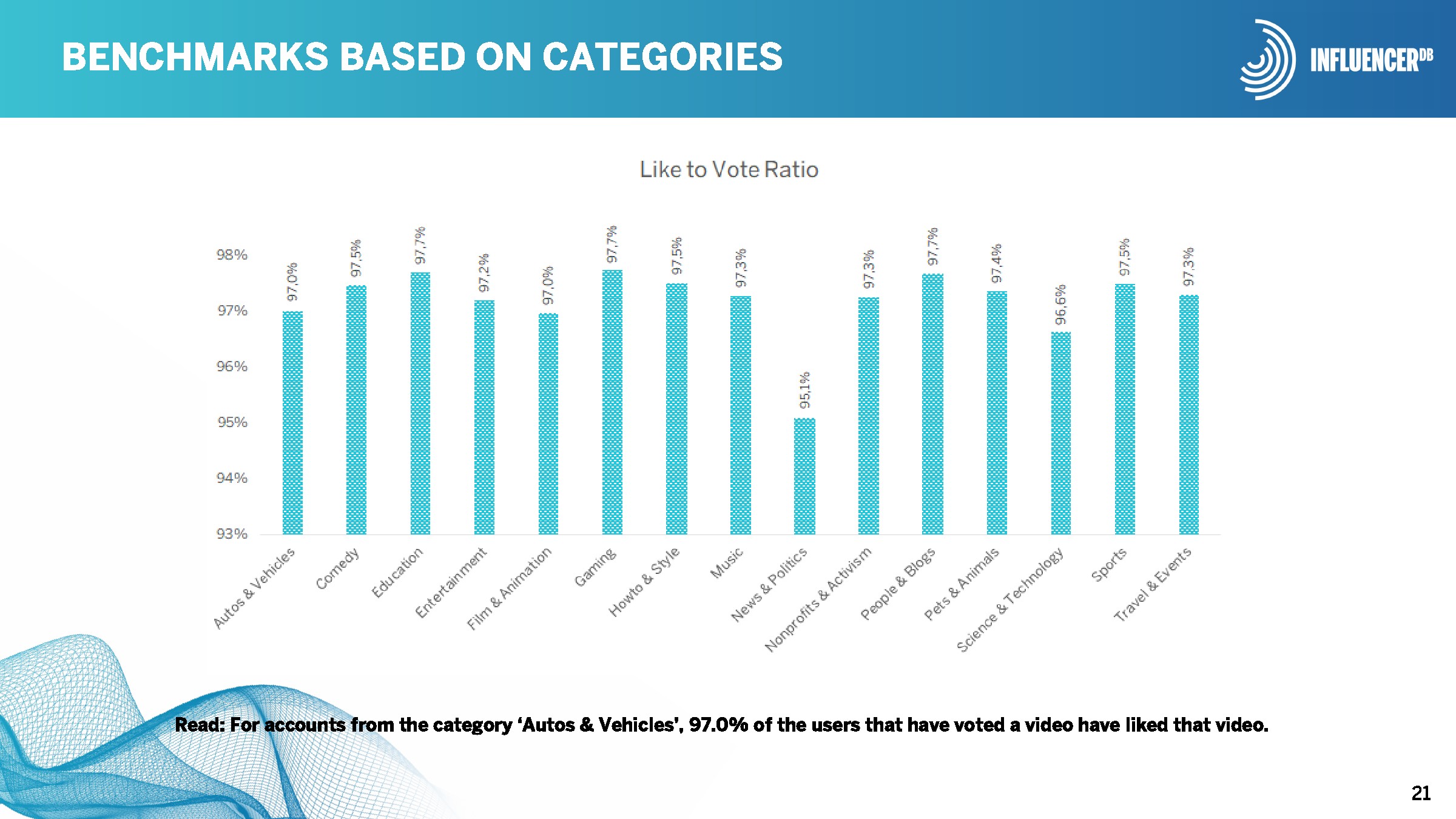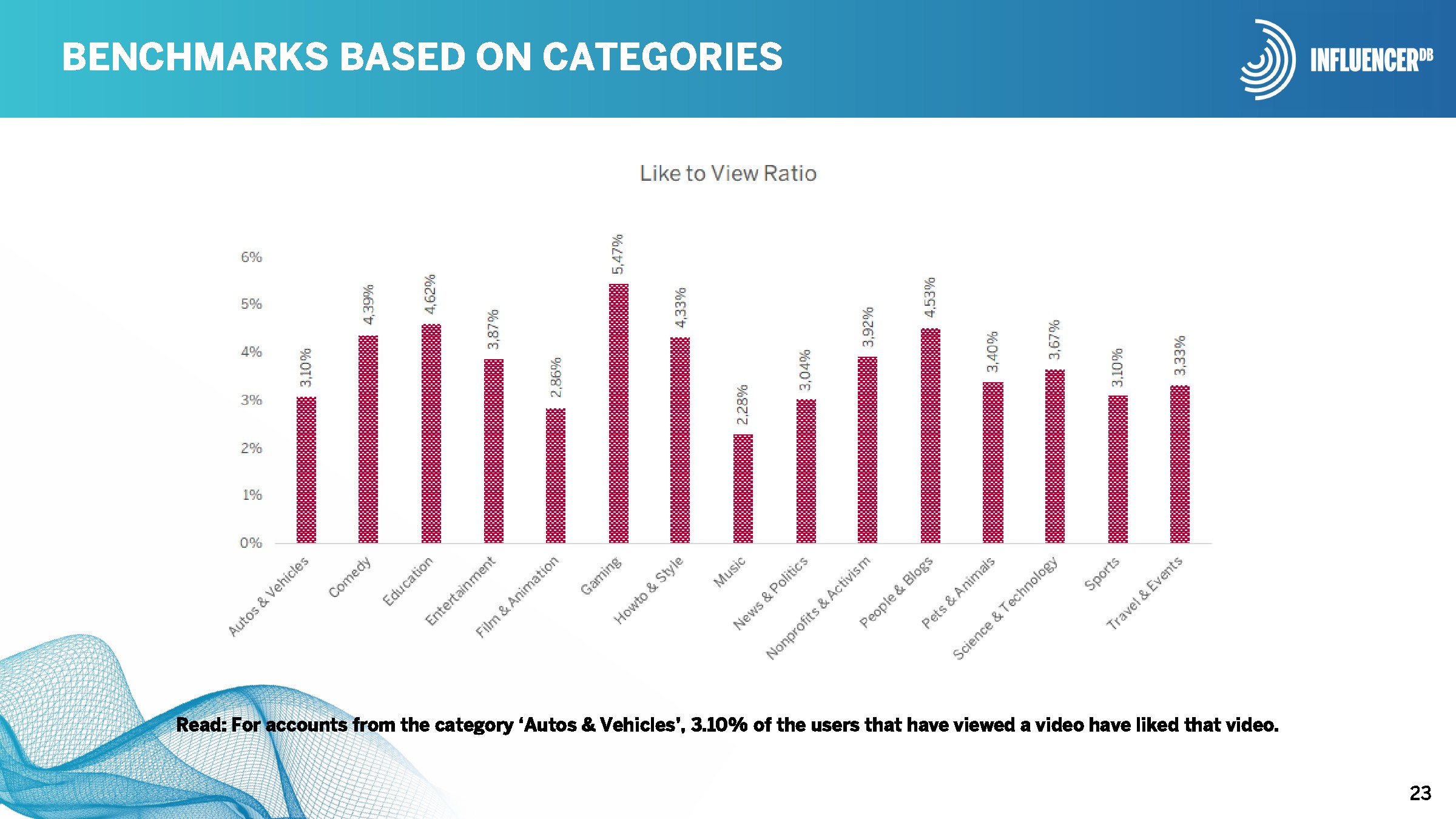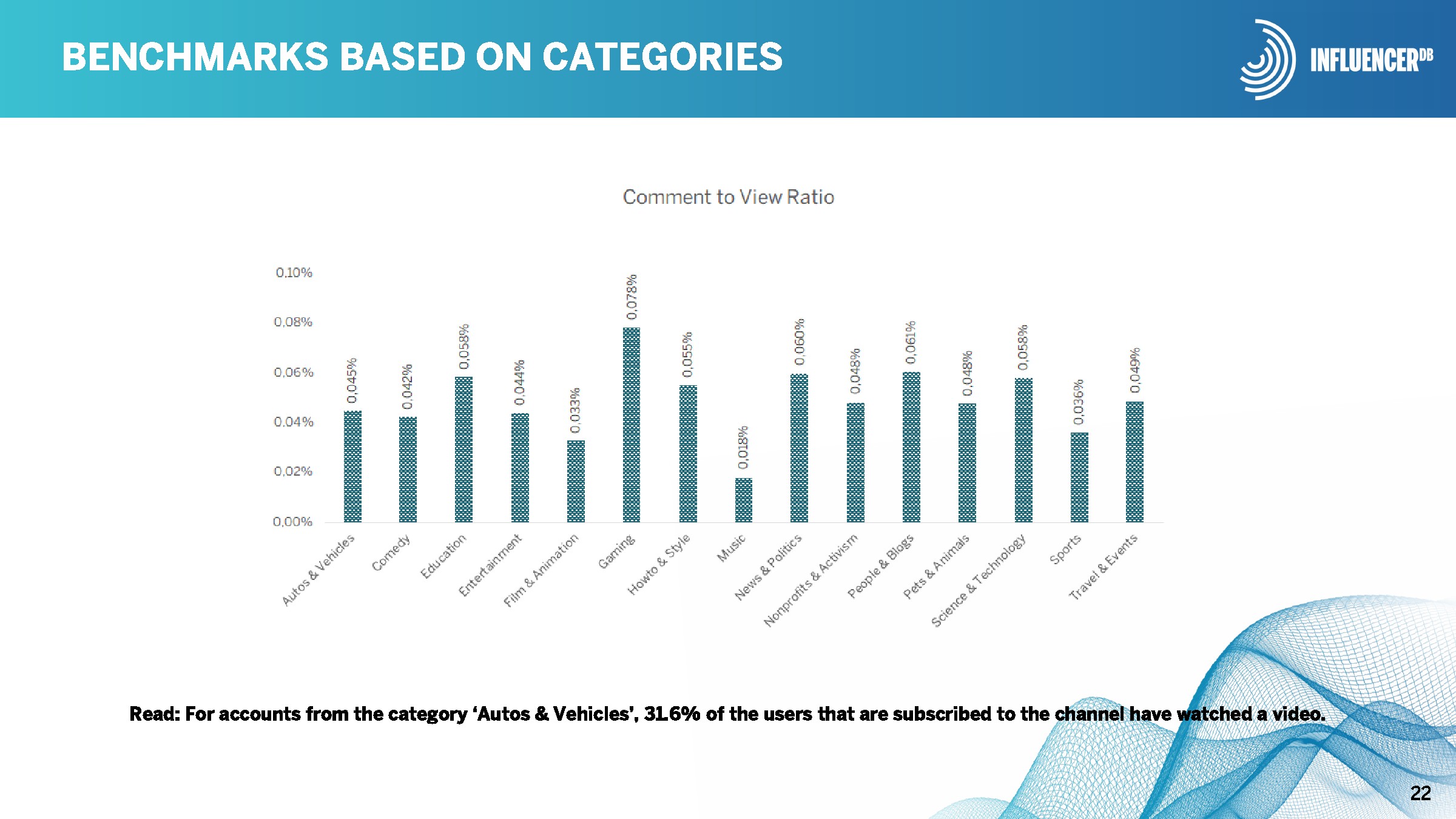 在Youtube上查看各种内容类别时,在评论浏览率(0.078%)和点赞浏览率(5.47%)方面,游戏类意见领袖的参与度名列前茅。考虑到游戏玩家不仅喜欢玩电子游戏,而且他们也喜欢转向YouTube等网站观看其他人的游戏,这并不太令人惊讶。