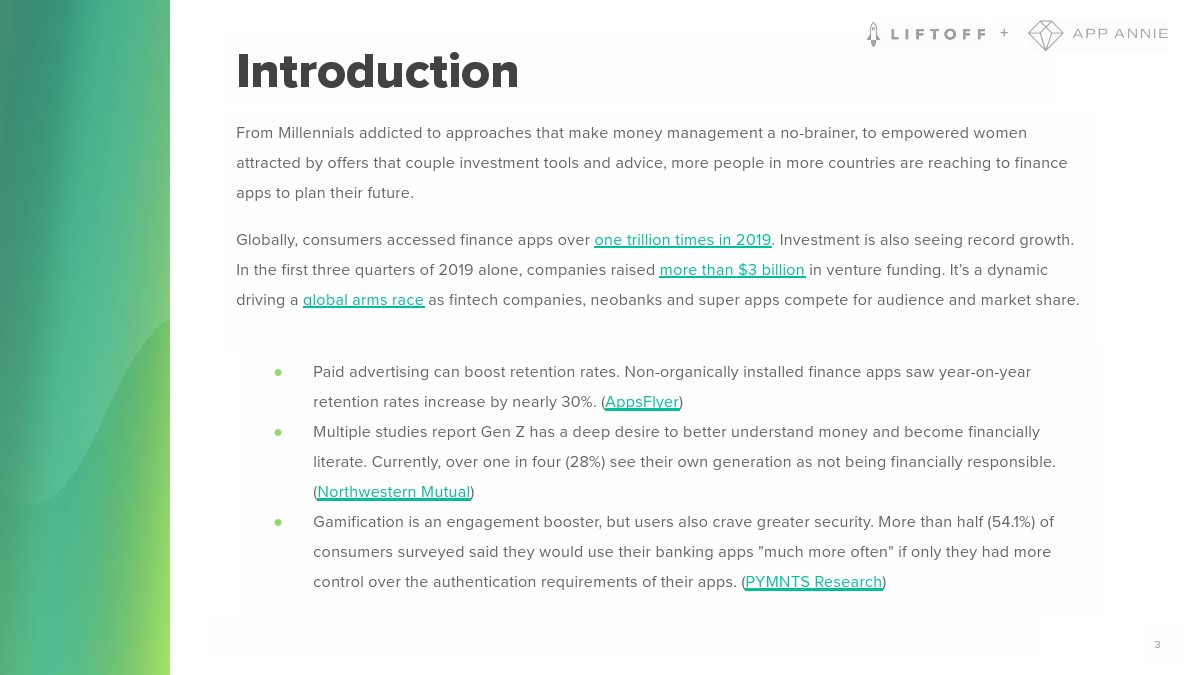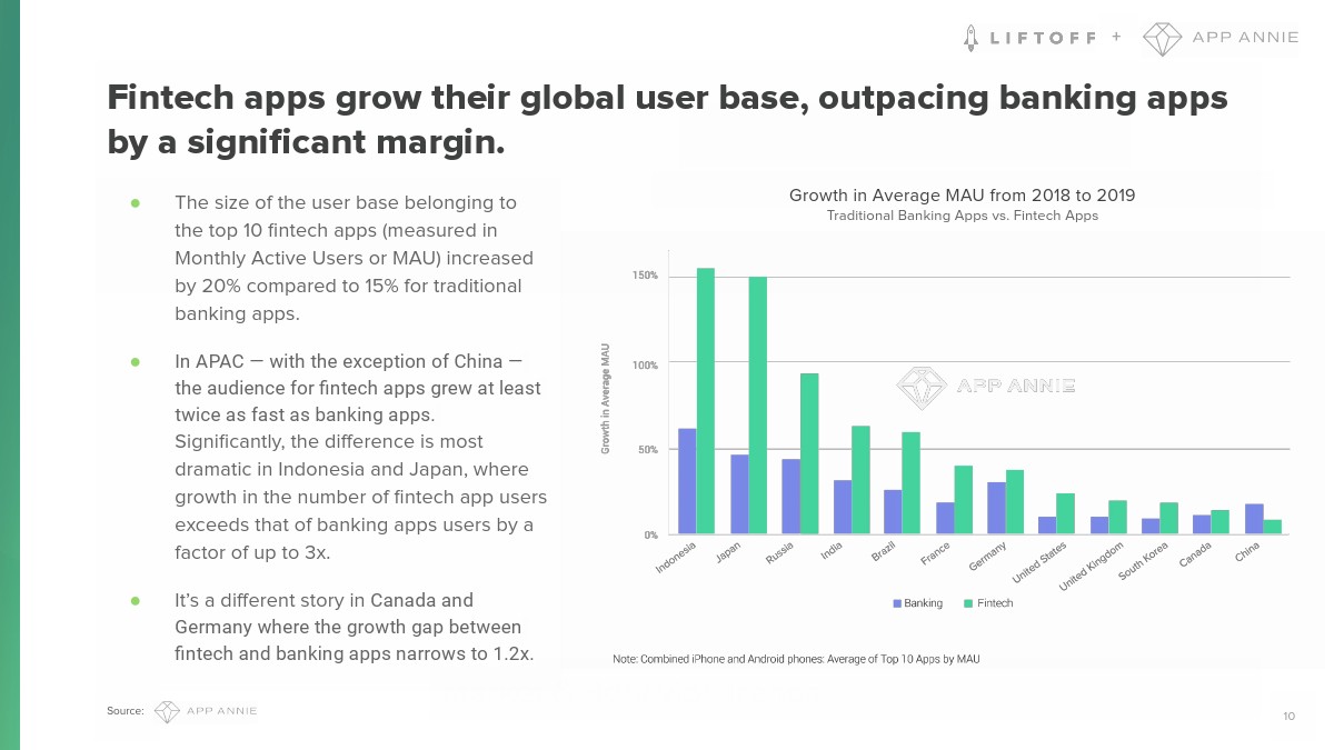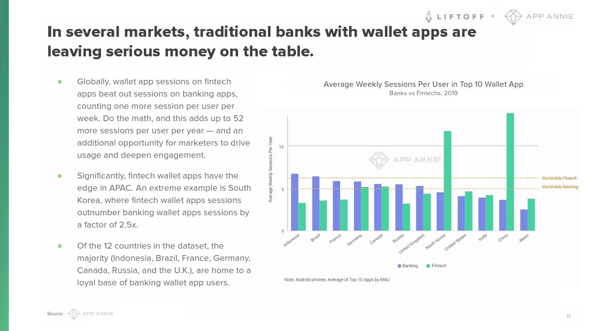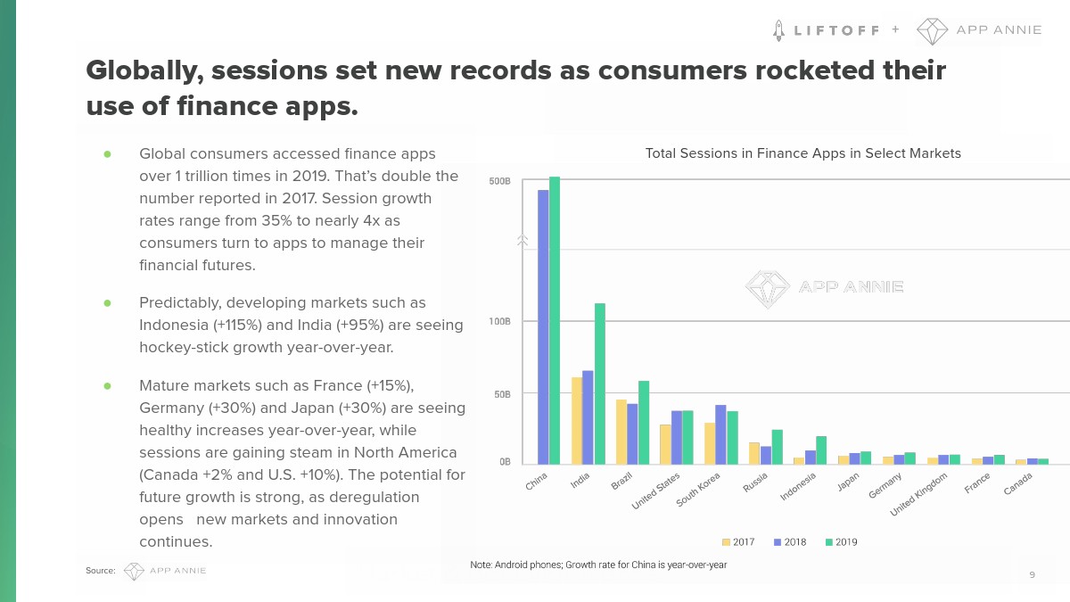 App Annie发布了“2020移动金融应用报告”。2019年金融应用会话数量突破1万亿大关,印尼和印度等发展中市场推动了大部分增长。
