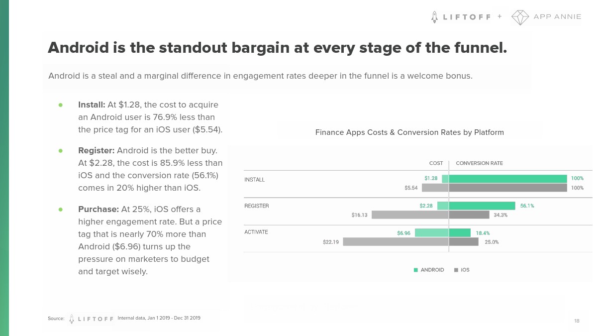 安卓用户获取是一笔划算的交易,激活起来也是轻而易举的事。虽然iOS的安装购买率比安卓高出25%,但这是有代价的。在渠道深处获取iOS用户的成本要高出70%。