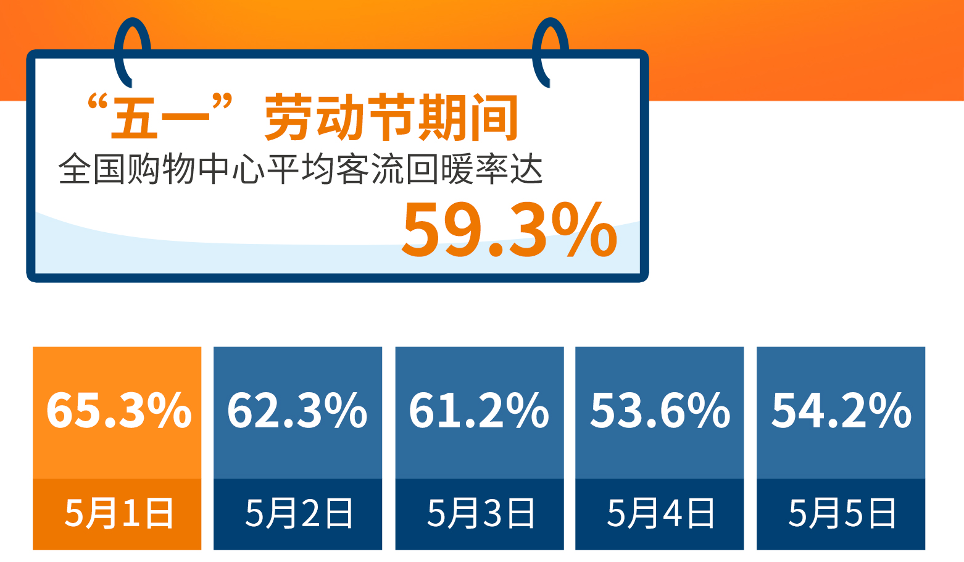 据汇客云平台“全国购物中心客流回暖监测”显示,“五一”小长假期间,5月1日至5月5日,全国购物中心平均客流回暖率达59.3%。其中,5月1日回暖率最高,为65.3%,假期首日全国各地均迎来可观的消费反弹。其后5月2日至5月5日回暖率分别为62.3%、61.2%、53.6%和54.2%。