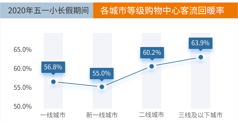 其中,“五一”小长假期间,一线城市购物中心平均客流回暖率为56.8%,新一线城市平均客流回暖率为55.0%,二线城市平均客流回暖率为60.2%,三线及以下城市平均客流回暖率为63.9%。