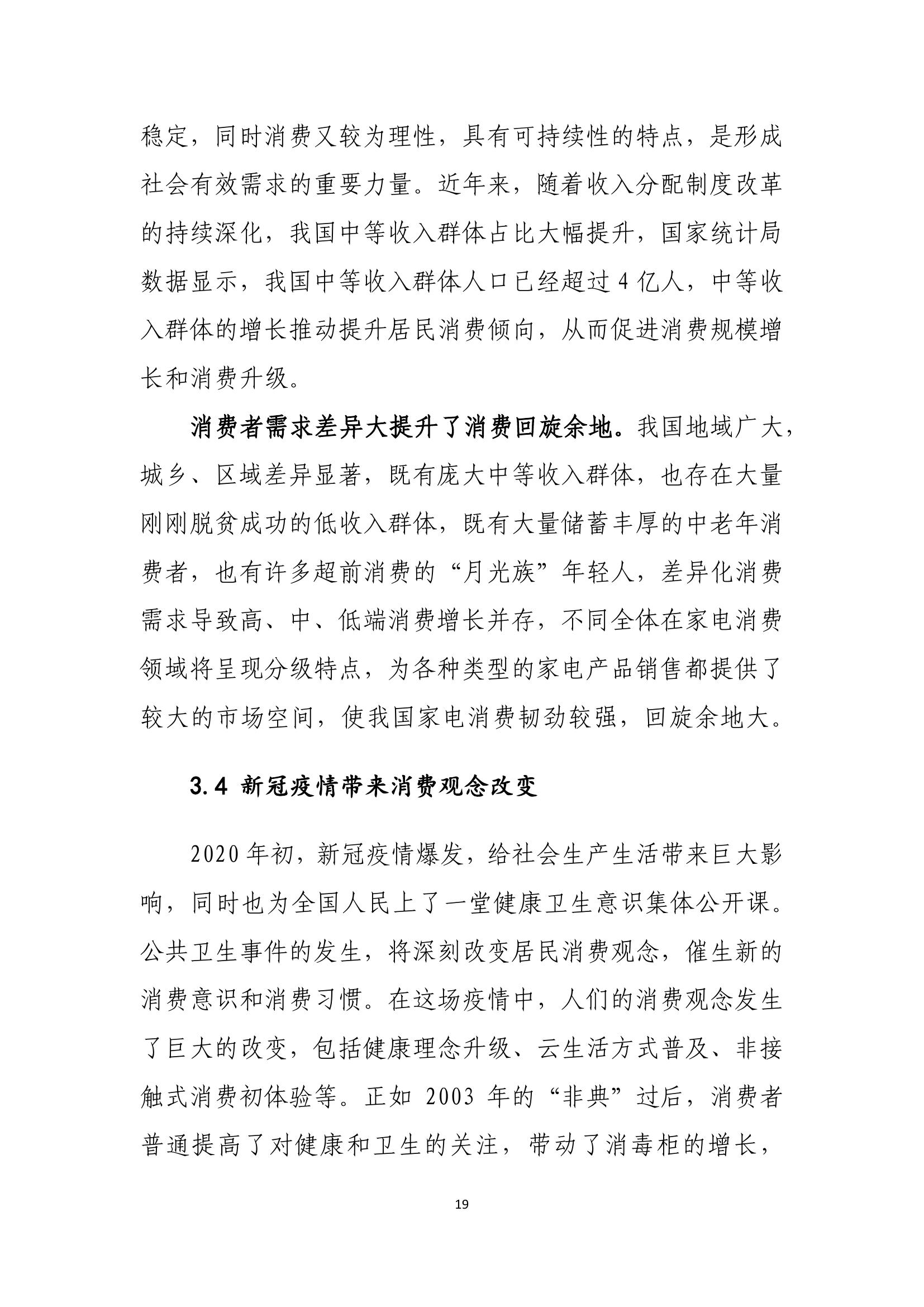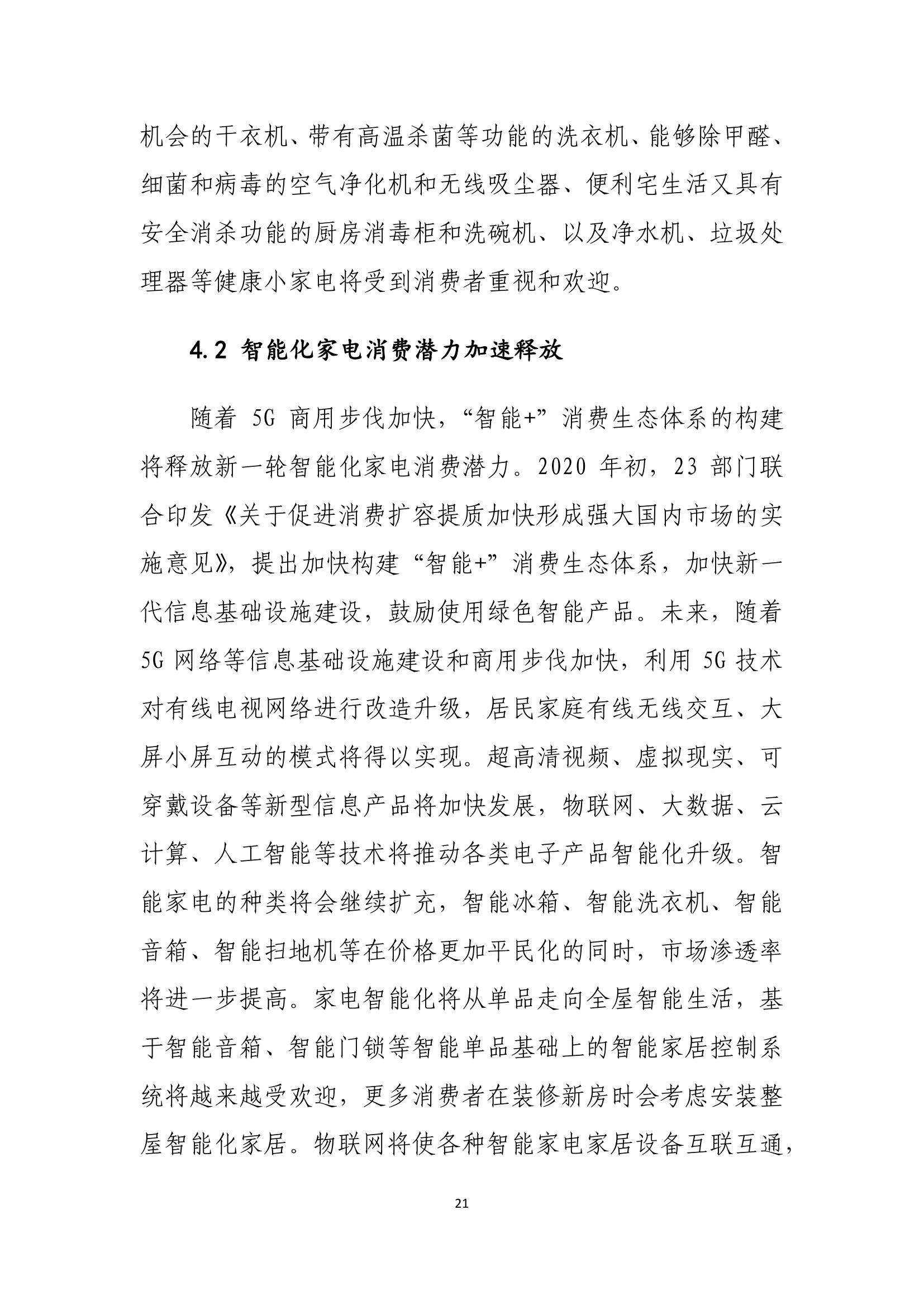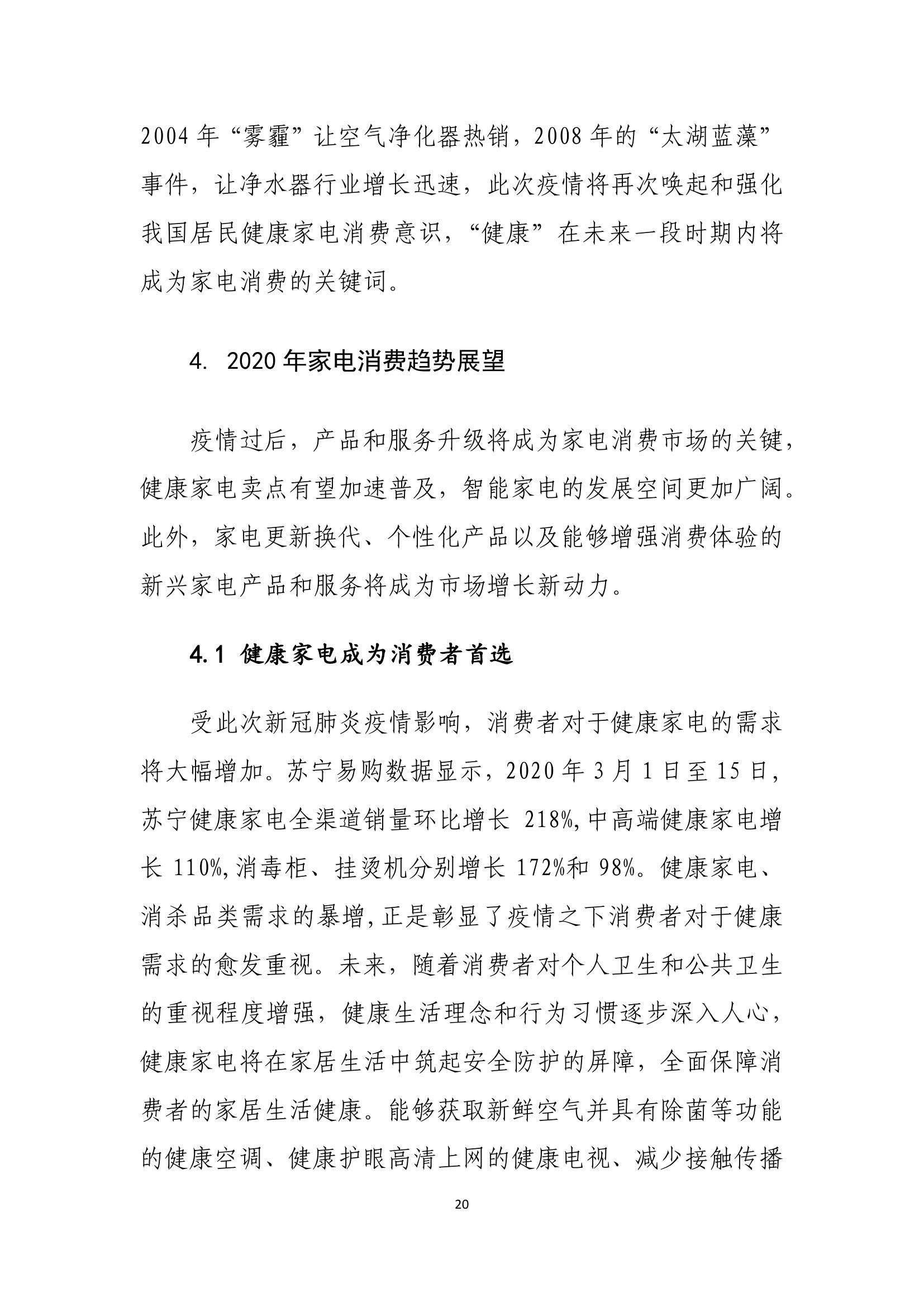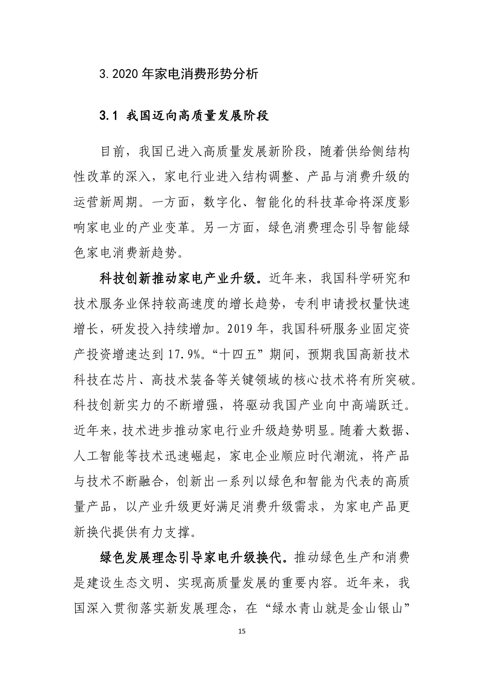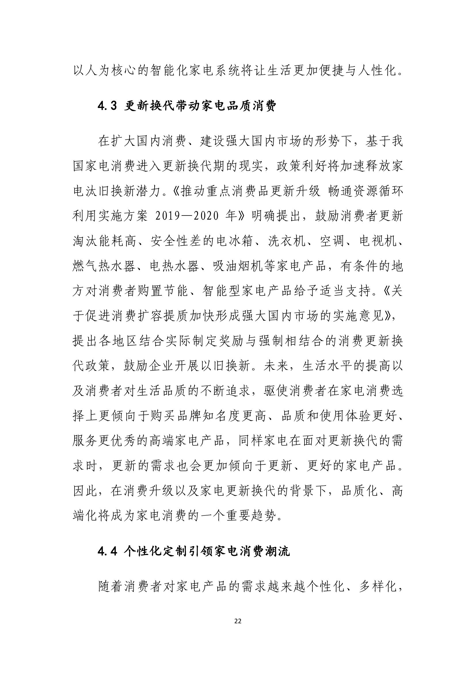 商务部研究院:2020年家电消费趋势报告 商务部研究院发布《2020年家电消费趋势报告》,综合分析2019年以来家电行业发展现状、消费政策、疫情影响等形势,对2020年家电消费趋势进行权威判断。 PDF版本将分享到199IT知识星球,扫描下面二维码即可! 更多阅读:frog:2020年趋势报告商务部研究院:RCEP对区域经济影响评估报告商务部研究院:中国与阿拉伯国家经贸合作回顾与展望2022奥维云网:2025年国庆大屏电视销量预增58%,激光投影增83%InMoment:2018年零售客户体验趋势报告爱立信:2019年十大热门消费者趋势报告商务部研究院:2019年电子电器产品消费报告商务部:2020年春季国际商品市场走势欧盟委员会:2020年欧洲经济预测(春季版)未来今日研究所:2020年科技趋势报告(366页)国际移民组织:2020年世界移民报告世界经济论坛:2020年全球风险报告2020年全球经济展望:缓慢增长,政策挑战联合国:2020年世界粮食安全和营养状况报告联合国贸易和发展会议:2020年世界投资报告(268页)