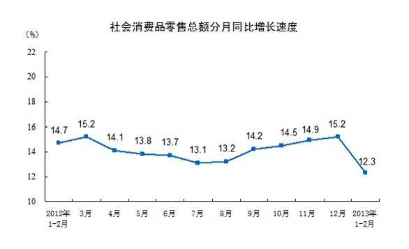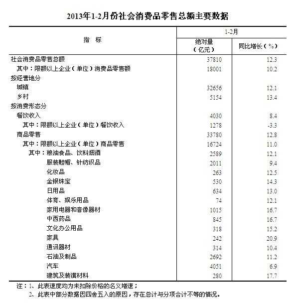 2013年1-2月份,社会消费品零售总额37810亿元,同比名义增长12.3%(扣除价格因素实际增长10.4%,以下除特殊说明外均为名义增长)。其中,限额以上企业(单位)消费品零售额18001亿元,增长10.2%。