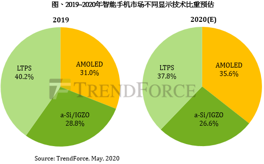 LTPS面板过去两年来产能扩充速度放缓,供货相对稳定,但由于价格竞争激烈,加上在窄边框、省电等规格表现不错,逐渐成为智能手机市场的主流,迫使a-Si面板只能往低端市场靠拢。不过随着AMOLED面板供货能力大增,已侵蚀LTPS面板在中高端市场的市占。而疫情对整体手机市场的冲击逐渐发酵,品牌客户更倾向拉长贩售旧机种的时间,或是维持甚至扩大低端机种的数量,也不利于LTPS机种渗透率在中阶市场的维持,预期LTPS机种将从2019年的40.2%下滑至2020年37.8%;a-Si机种则从2019年的28.8%下滑至26.6%,LTPS机种衰退幅度略大于a-Si机种。