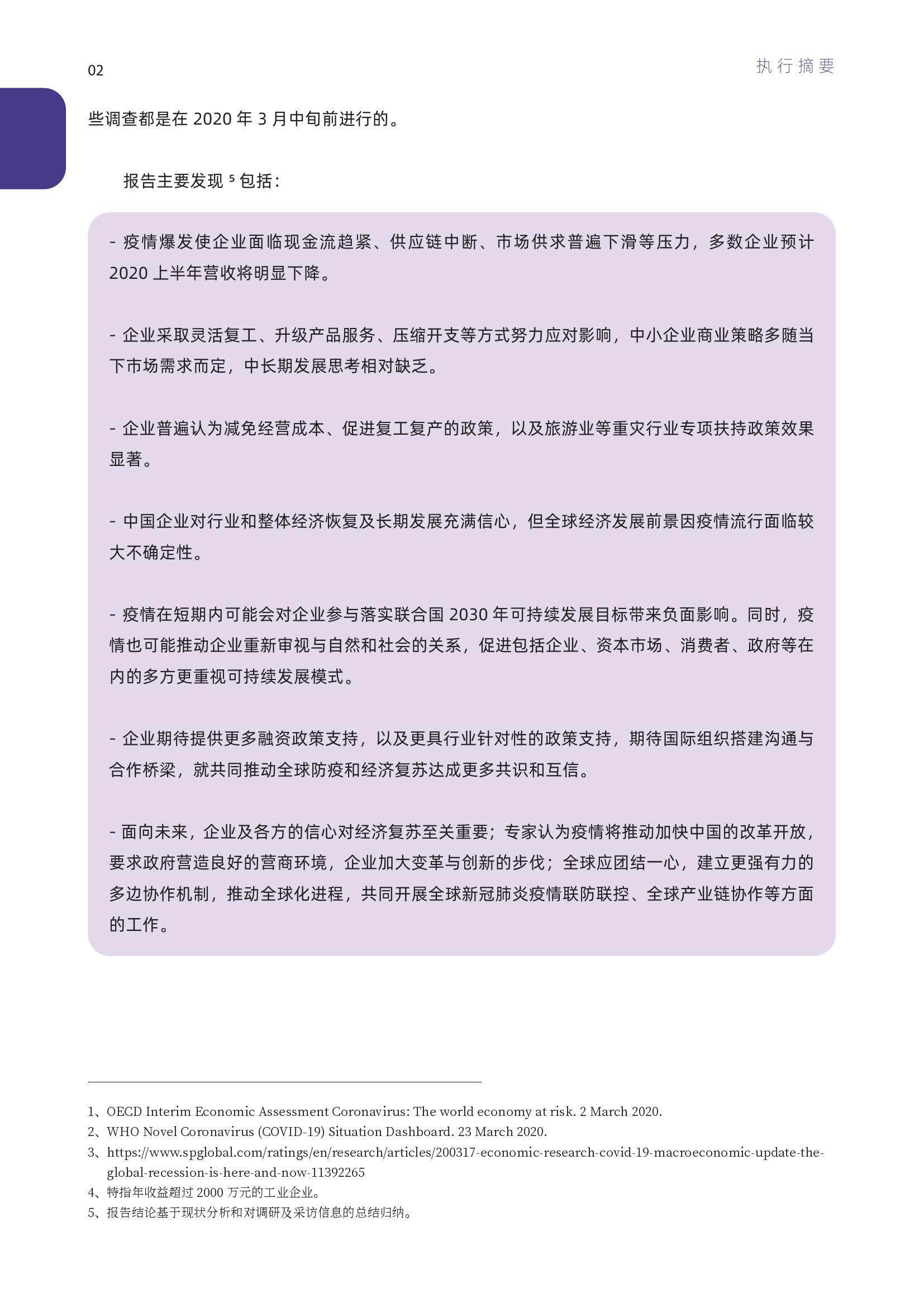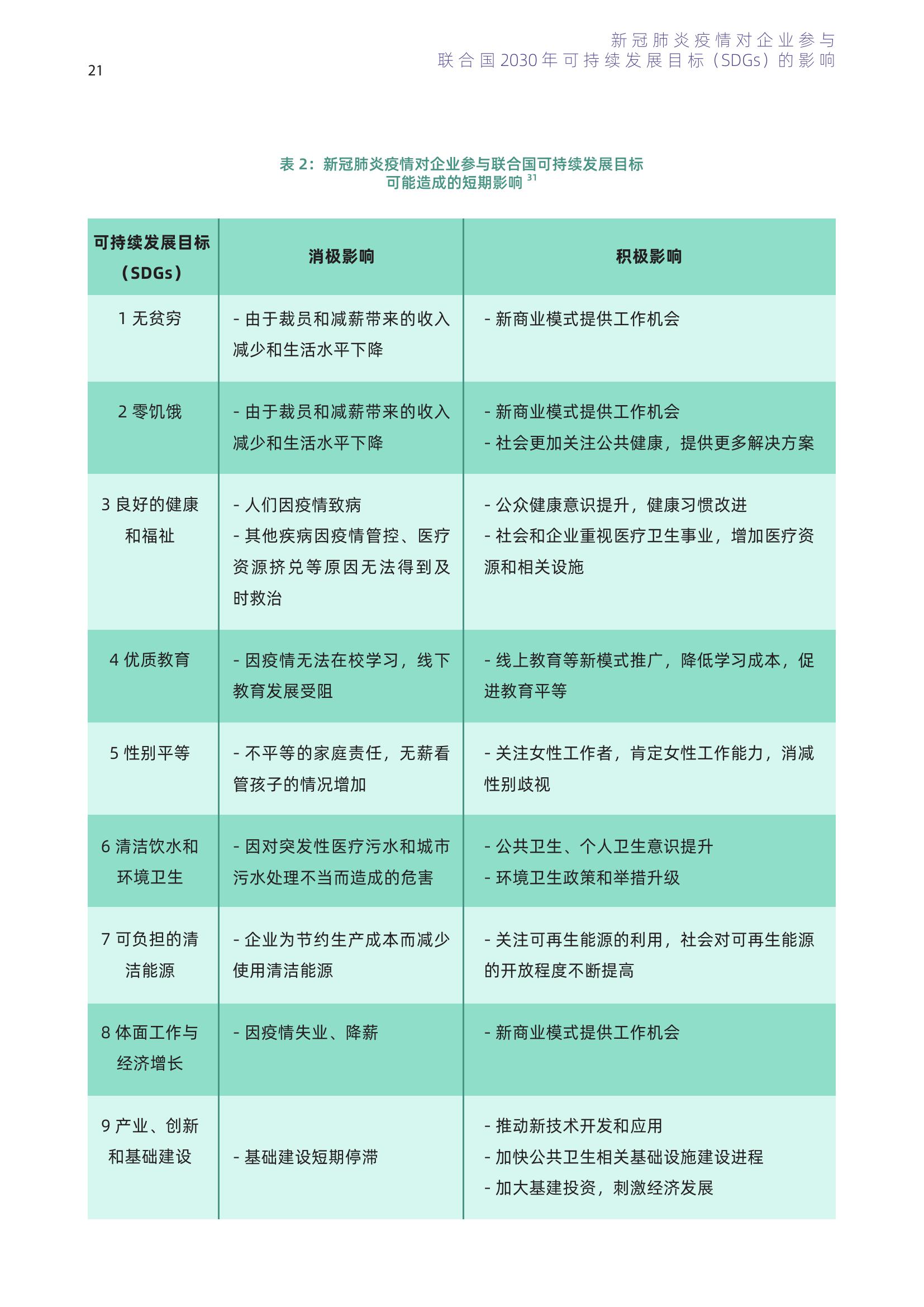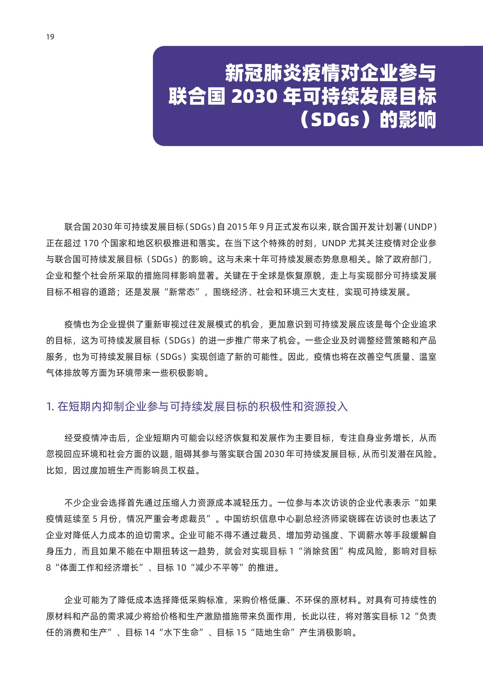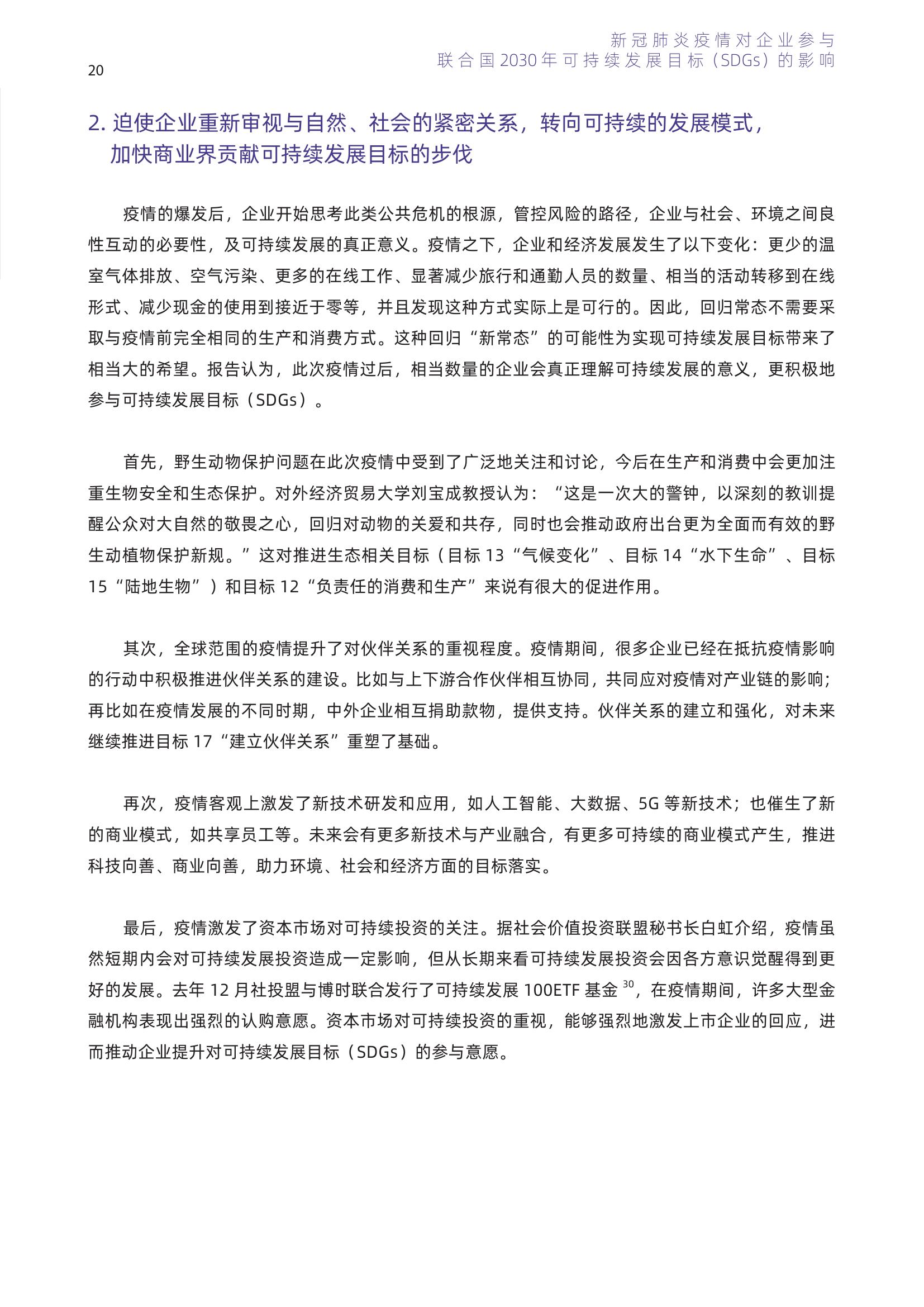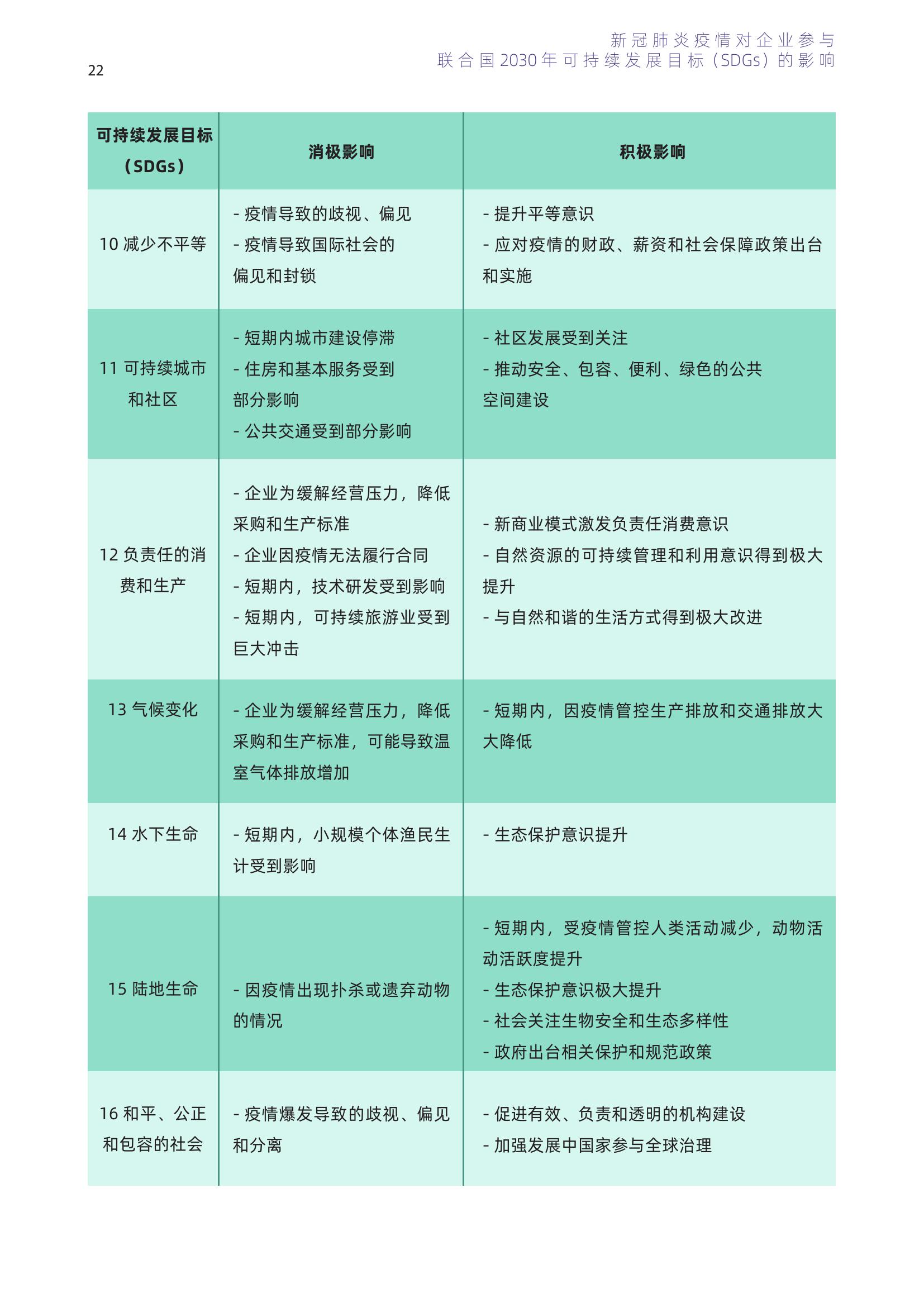 - 疫情在短期内可能会对企业参与落实联合国2030 年可持续发展目标带来负面影响。同时,疫情也可能推动企业重新审视与自然和社会的关系,促进包括企业、资本市场、消费者、政府等在内的多方更重视可持续发展模式。