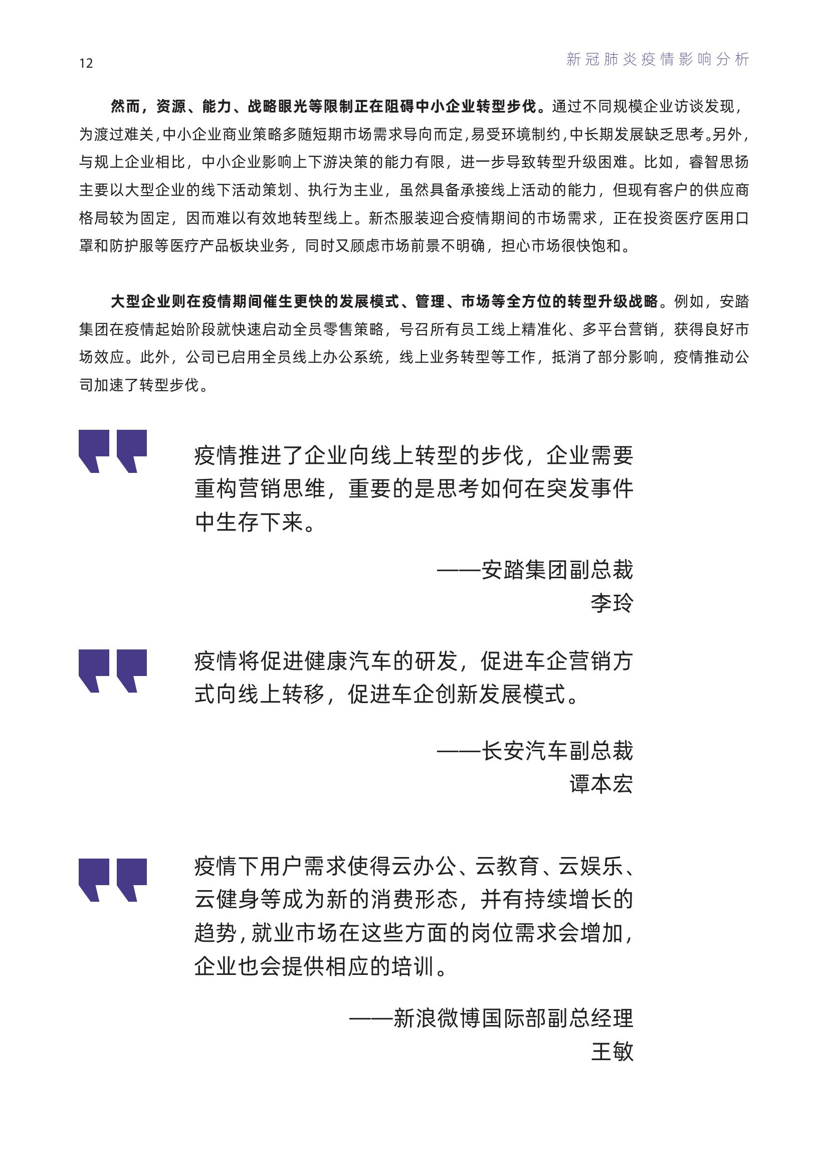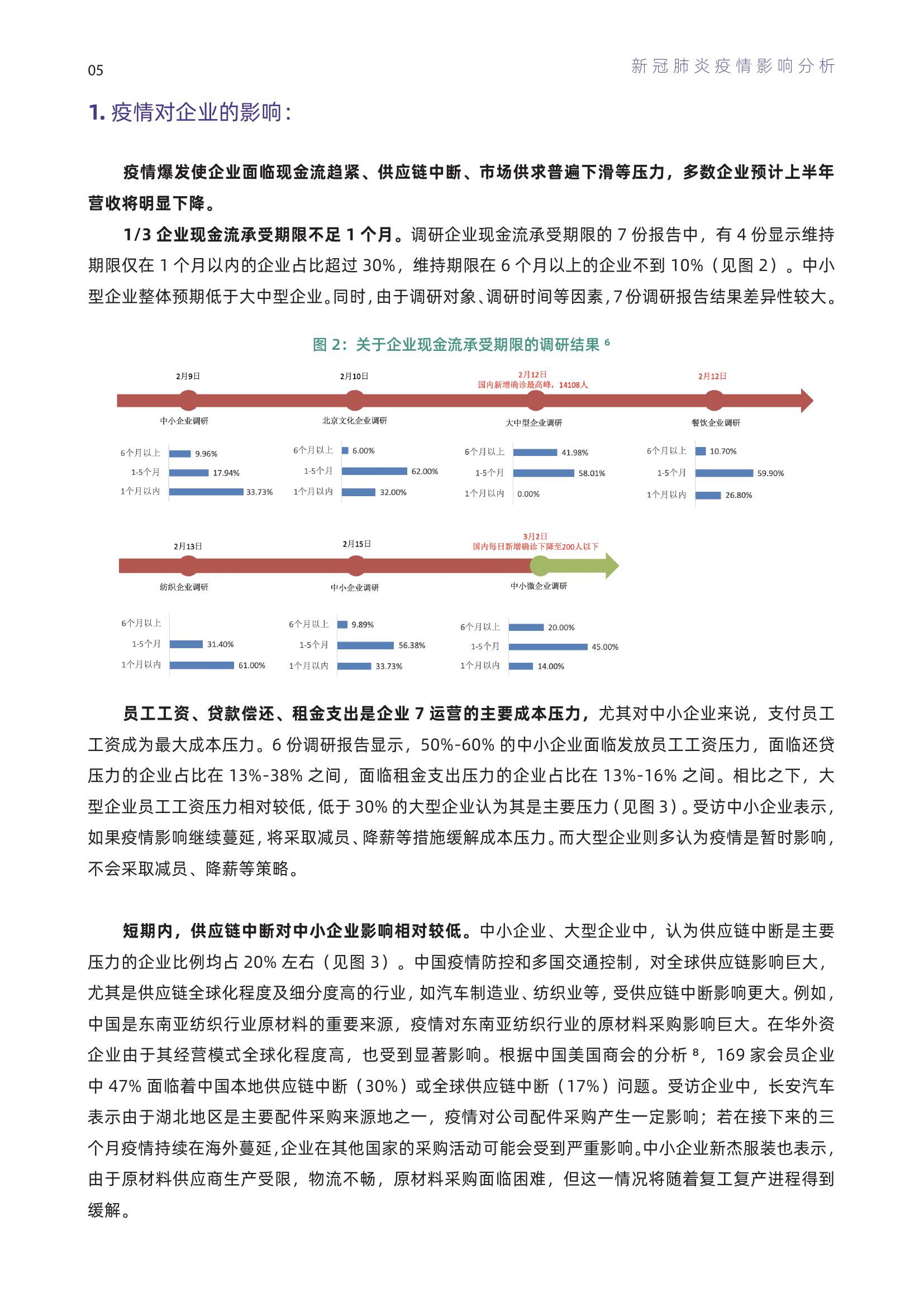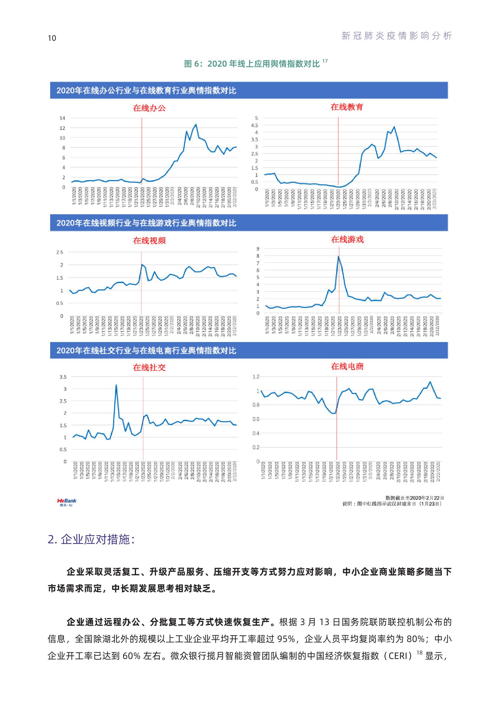 - 企业采取灵活复工、升级产品服务、压缩开支等方式努力应对影响,中小企业商业策略多随当下市场需求而定,中长期发展思考相对缺乏。