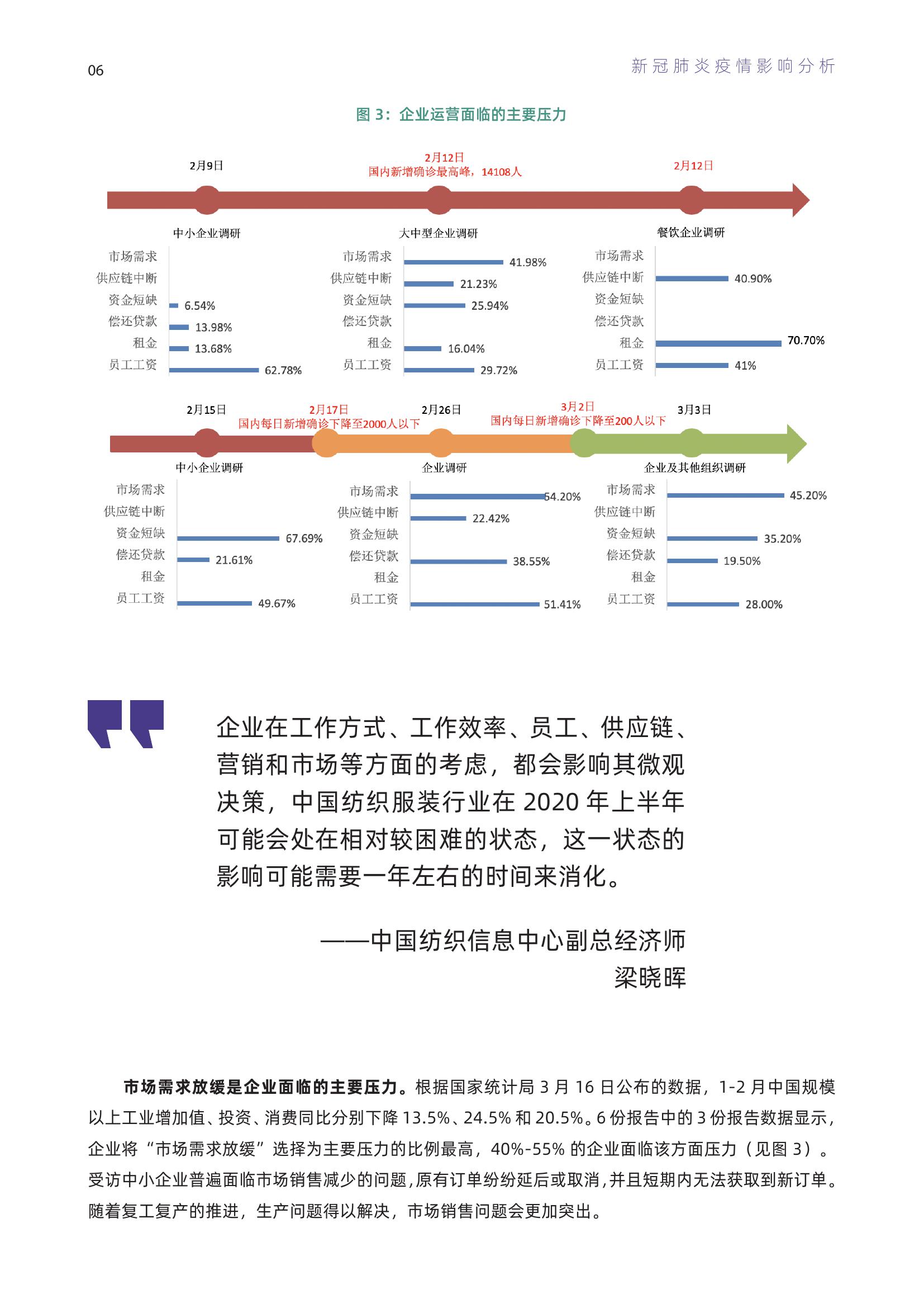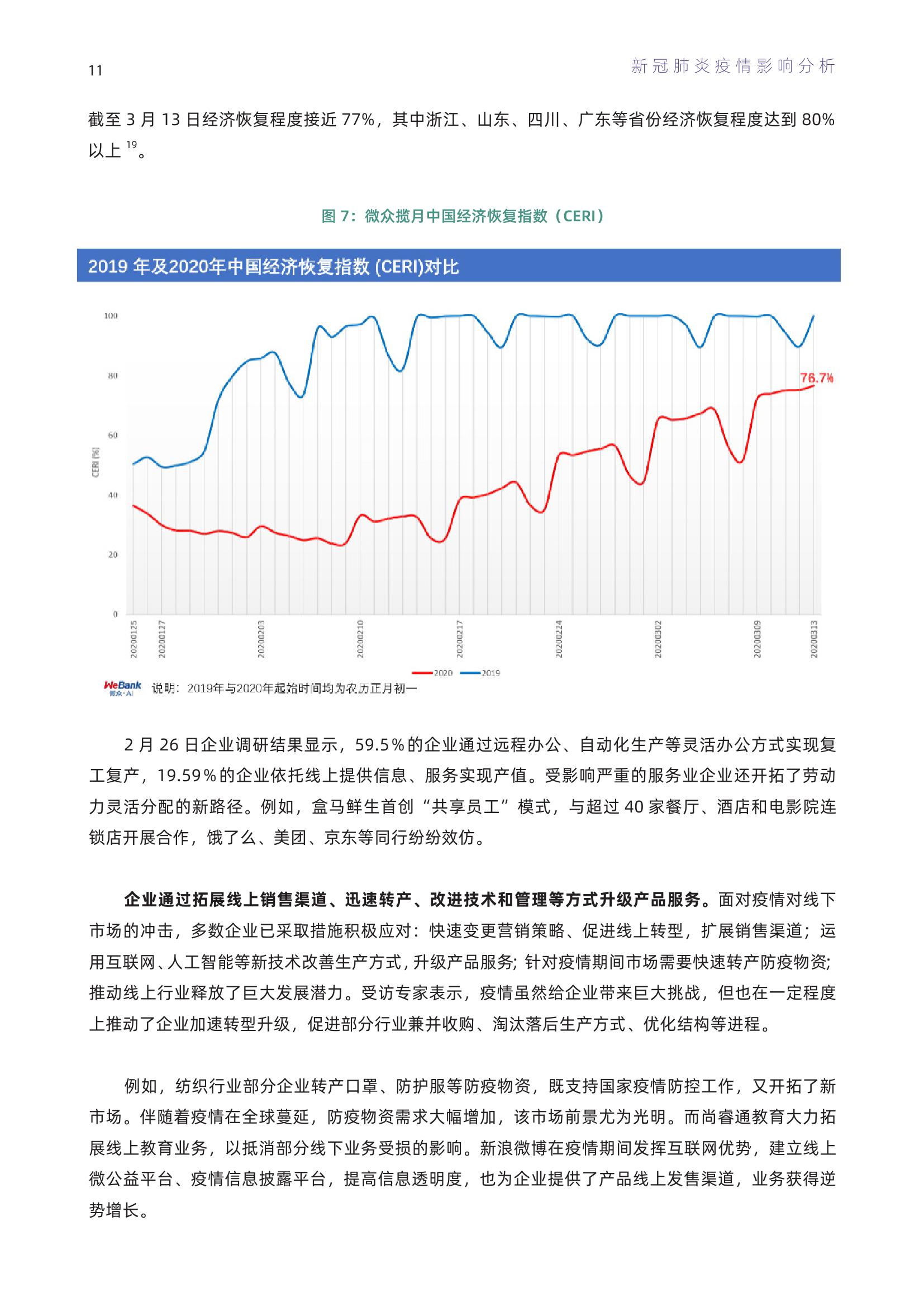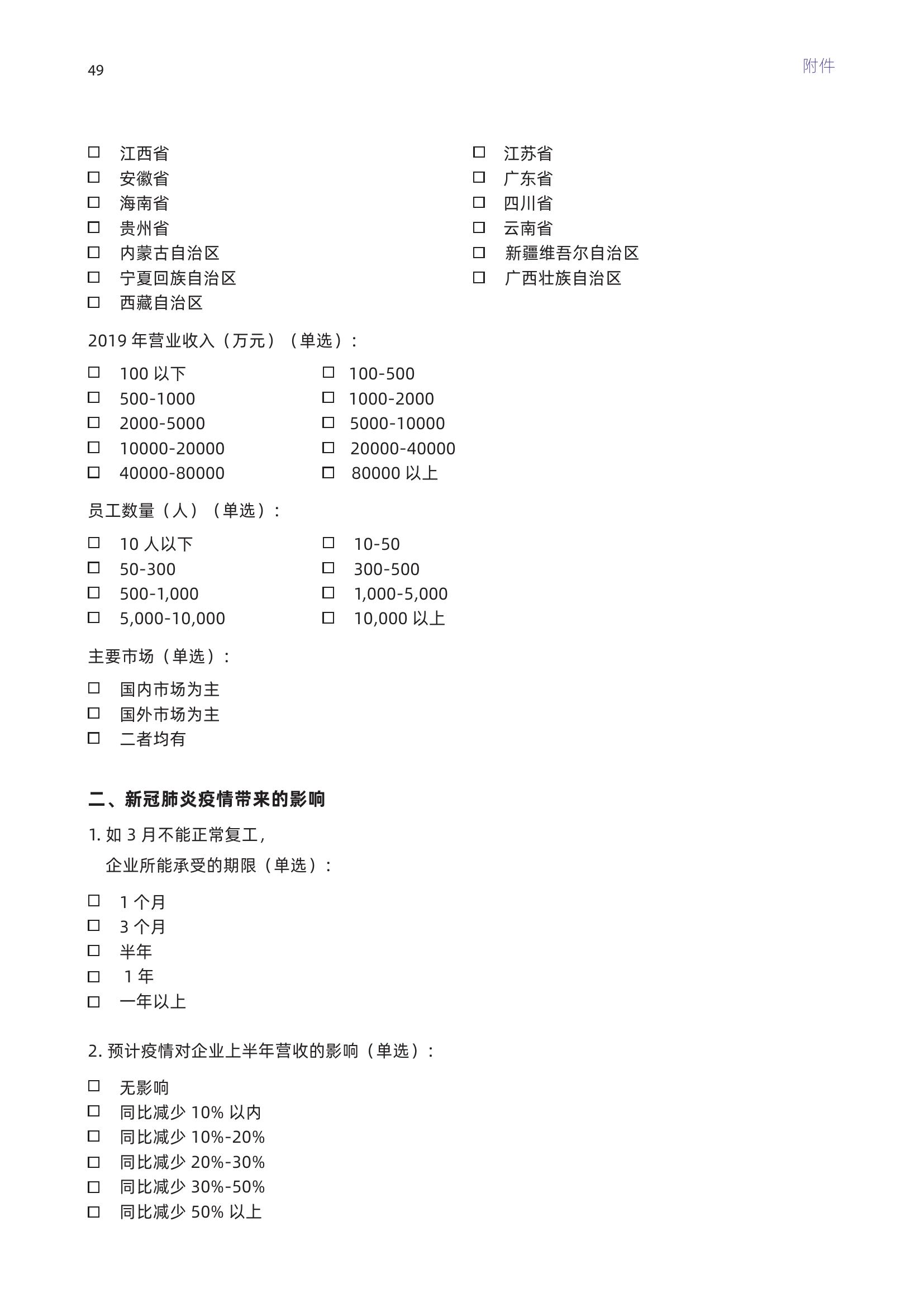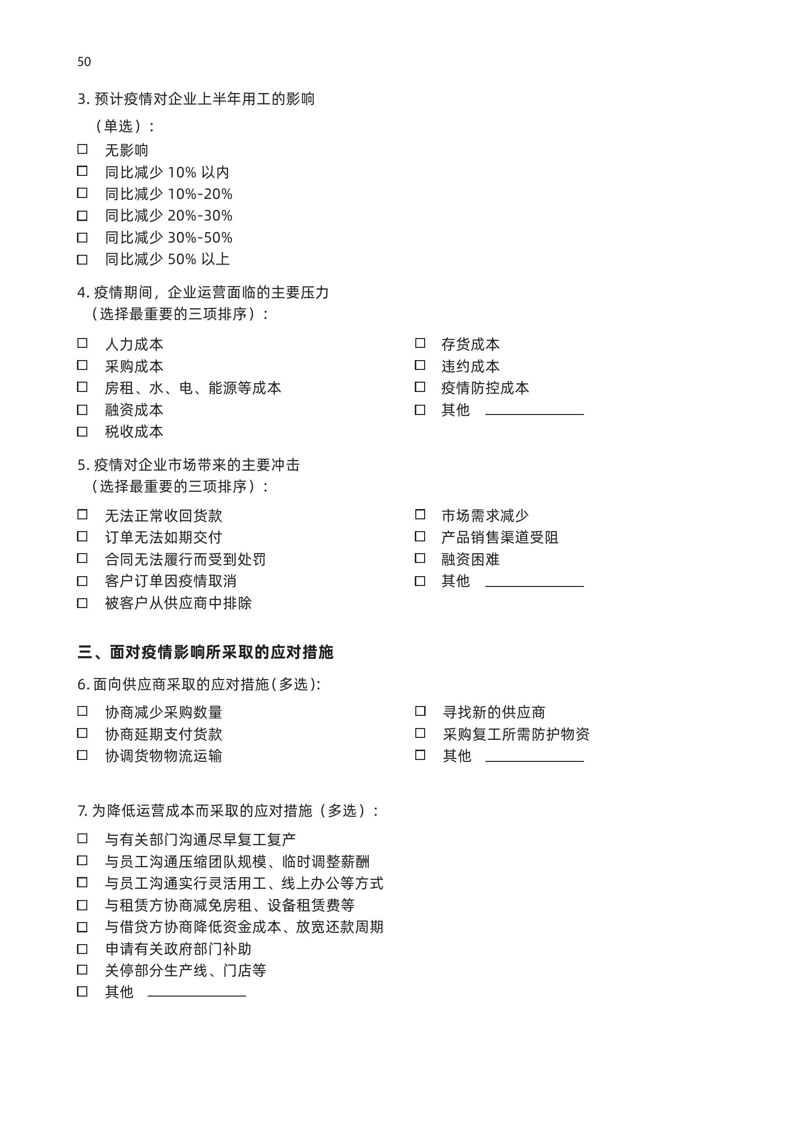- 企业采取灵活复工、升级产品服务、压缩开支等方式努力应对影响,中小企业商业策略多随当下市场需求而定,中长期发展思考相对缺乏。