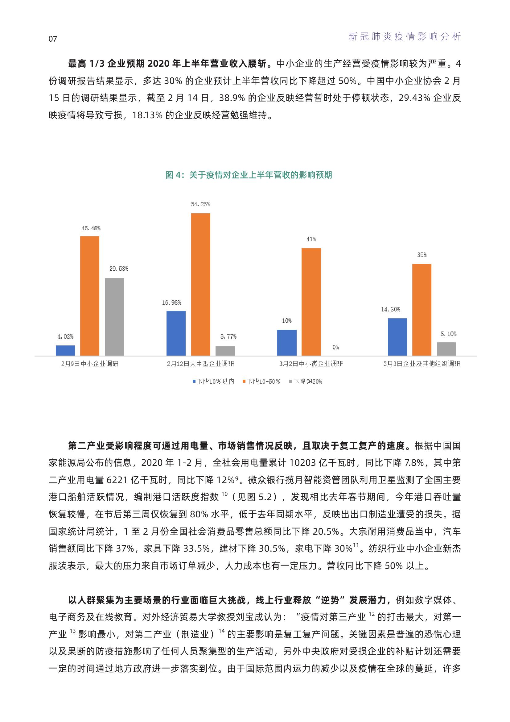 - 疫情爆发使企业面临现金流趋紧、供应链中断、市场供求普遍下滑等压力,多数企业预计2020 上半年营收将明显下降。