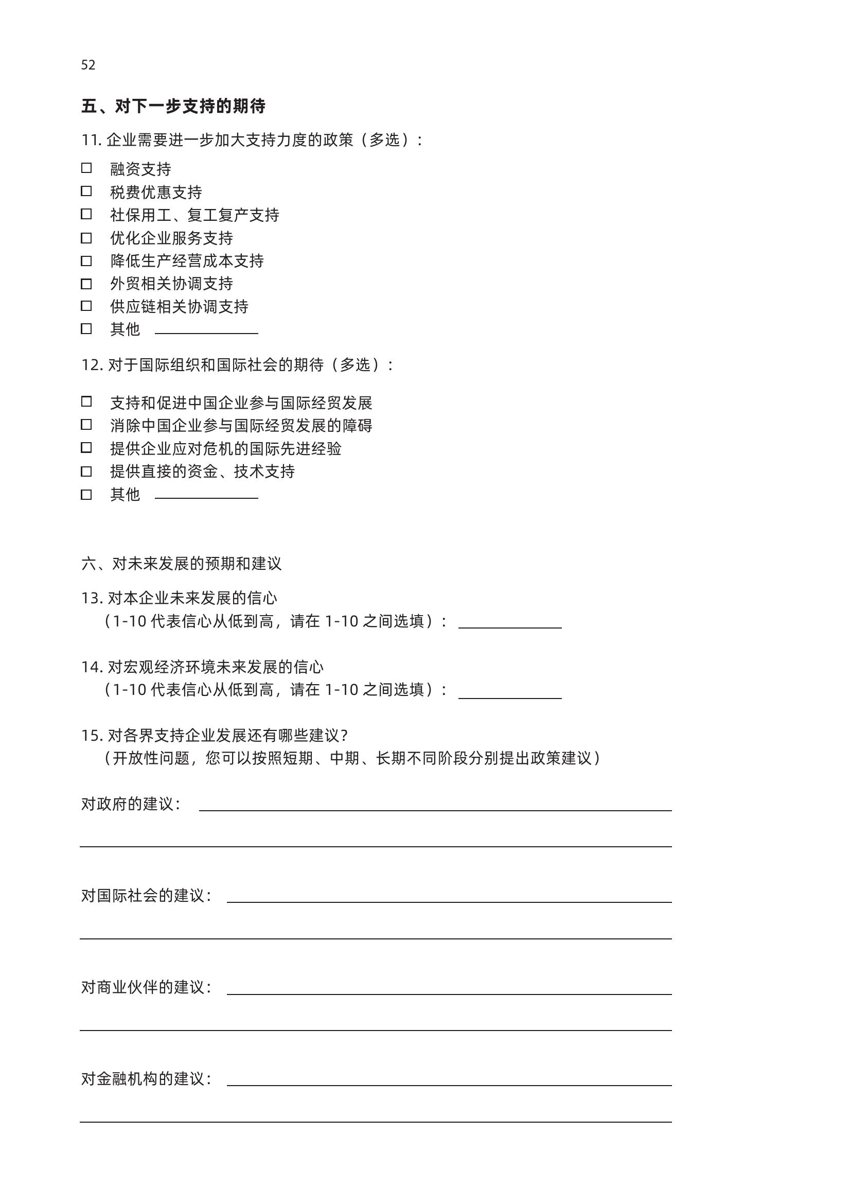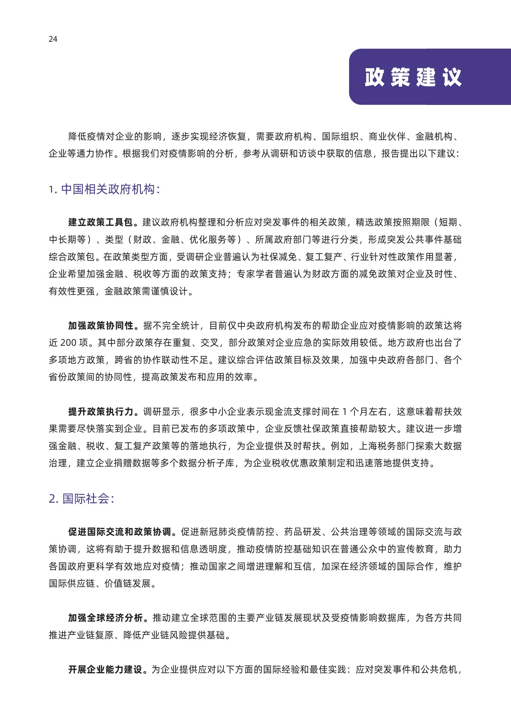 - 企业期待提供更多融资政策支持,以及更具行业针对性的政策支持,期待国际组织搭建沟通与合作桥梁,就共同推动全球防疫和经济复苏达成更多共识和互信。
