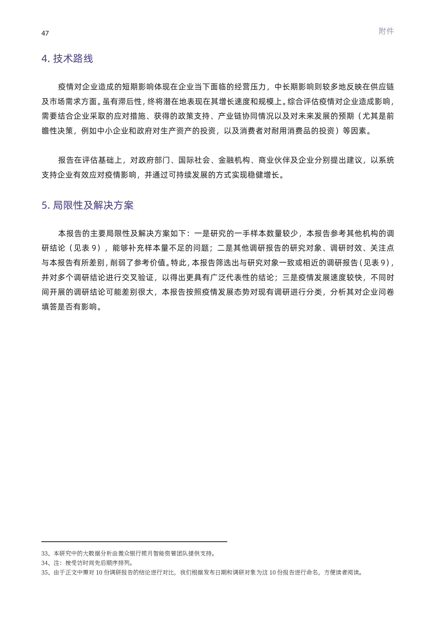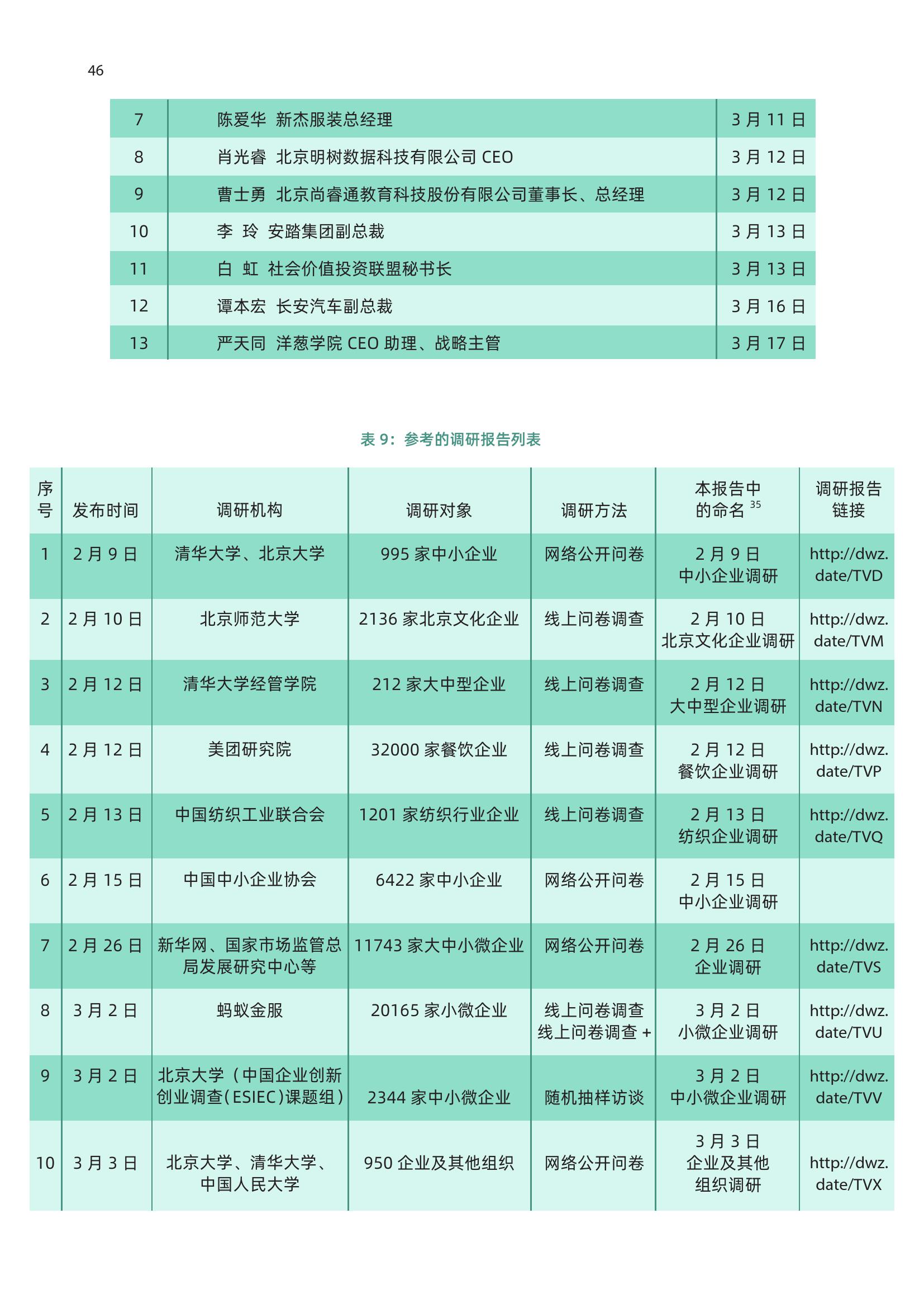 这份报告在创纪录的时间内发表的一个关键附加价值在于,它几乎基于实时的证据。这些证据来 自13次对企业代表深入的主题访谈,以及对10个组织发表的关于疫情影响的报告和研究文献的彻底审查。后者是对10项在线调查的汇总分析,调查对象涵盖了超过7.8万家中小企业和大规模的民营企业。所有这些调查都是在2020年3月中旬前进行的。