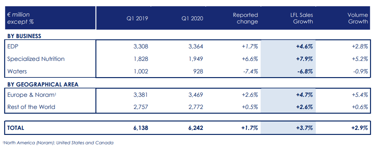 法国食品巨头达能(Danone)也公布了第一季度销售额增长,因为消费者囤积乳制品,特别是植物性和营养品。今年前三个月的销售额比去年同期增长了3.7%,达到62.4亿欧元。