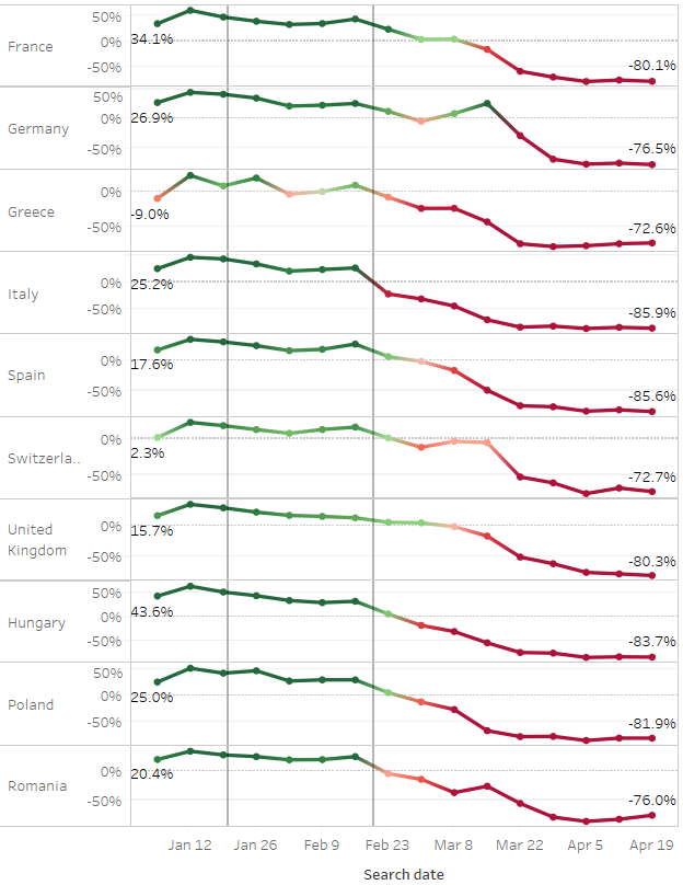 前往瑞士和希腊的旅游搜索量同比下降了73%,但与英国或法国等尚未实施封锁的国家相比,这一数字略高,这些国家搜索量同比下降了80%以上。
