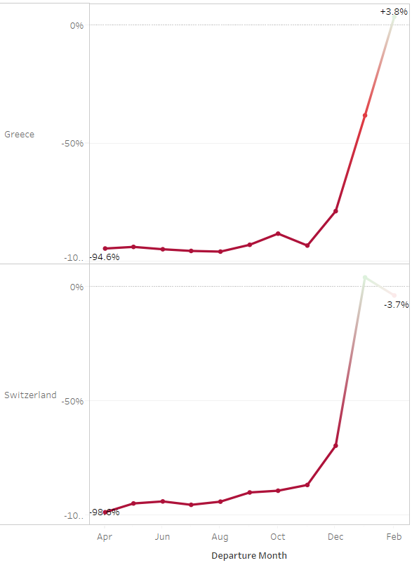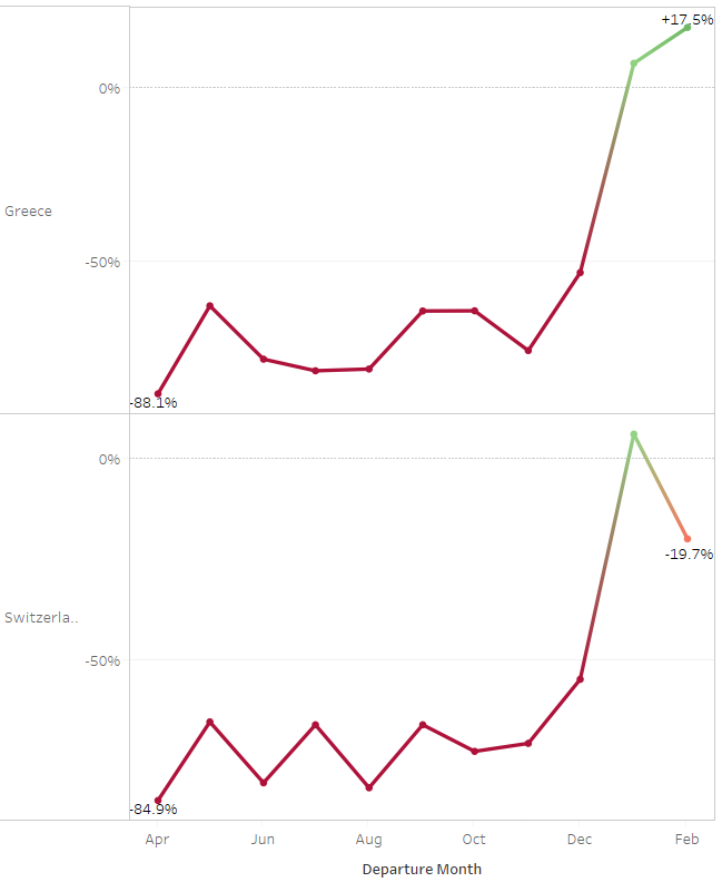 当我们更仔细地观察欧洲的旅行意愿时发现了上升趋势。到2021年2月,欧洲前往希腊的旅游搜索量同比增长了近18%。瑞士也显示出积极的上升趋势,预计这一趋势将在2021年1月达到顶峰。
