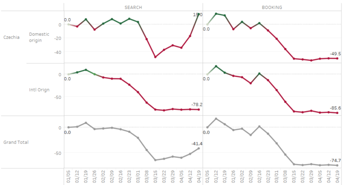 航班搜索和预订量仍然下降,这与前几周类似。由于旅行基本上处于停滞状态,这是意料之中的。
