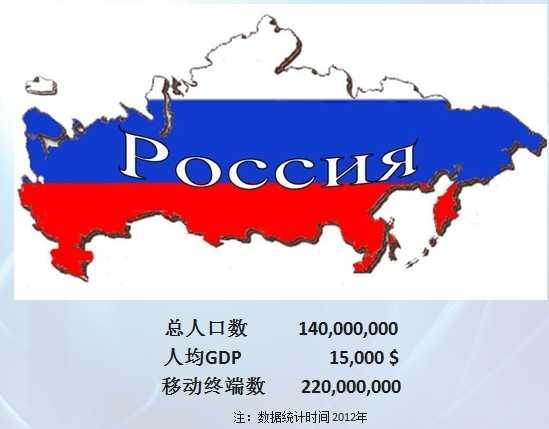 首先简单讲一下俄罗斯的情况,总人口1.4亿,移动终端数2.2亿,这个数据能看出,在俄罗斯人均持有移动终端超过1.5部,人均持有达到1到2部手机,可见俄罗斯人使用移动终端的频率非常高。