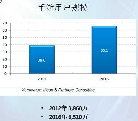 关于手游的用户规模。我们看简单的统计数据,在2012年有3860万手机用户,预计到2016年会超过6510万,这也是属于成倍增长的规模。这也要感谢中国手机企业,让成本降低之后,惠及了全球。