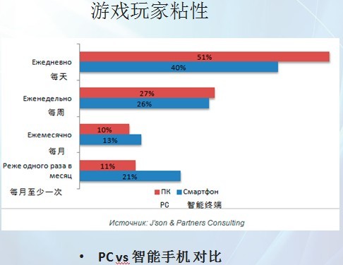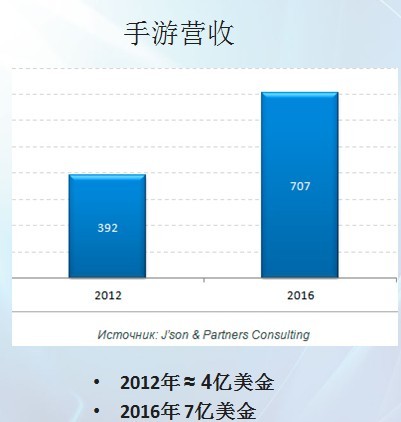 手机游戏营收。2012年手游营收在时4亿美金营收,预计2016年达到7亿美金左右。看一下PC游戏和智能手机的对比,很明显每天使用电脑的人数超过使用手机的人数。但是如果说每月至少上一次,手机用户人数会超过PC机。大家可以想象在俄罗斯很广阔的大地上面,互联网基础设施没有移动手机方便,这就是为什么俄罗斯的情况手机用户人均持有手机超过PC机的用户。