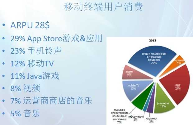 这里讲一下移动终端用户,多少俄罗斯用户会为移动应用付出多少钱?人均是28美金,不光在游戏里面,包括所有的移动应用,游戏、视频、音乐做出的贡献,我们单说JAVA游戏占11%,应用占的29%,俄罗斯总盘子没有中国这么大,可以想中国一个省的总量会可以更容易理解。