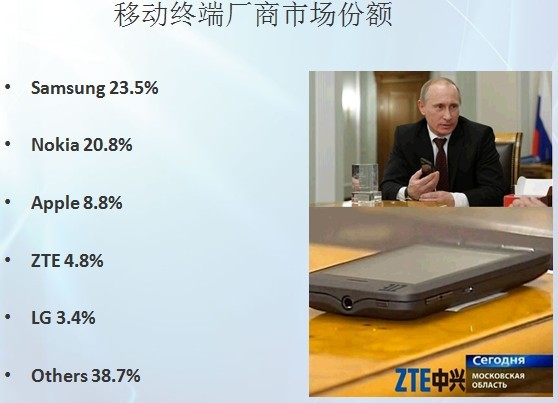 看一下大家比较关心移动终端的市场份额,三星在俄罗斯占了最大的市场份额,就算在诺基亚全胜的时代也没有拼过三星,诺基亚辉煌的时代还是三星占的第一,不是因为诺基亚不行了,然后三星才占到市场第一,在俄罗斯一直以来三星都是占市场份额排第一,剩下是苹果,大概10%不到,剩下是中兴有4.8%,LG3.4%,还有其他本土的品牌。