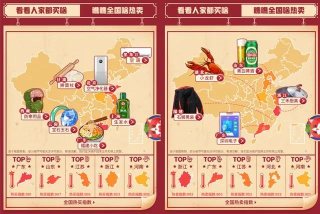 榜单还显示,来自浙江、广东、江苏、河北等中国制造产业带的商品最受消费者追捧。特别是浙江宁波厨具、山东青岛啤酒、福建石狮男装、湖北小龙虾、广东深圳数码3C、广东东莞服装等产业链成熟、完善的产业带,平均贡献了七成以上同类目商品的供应。