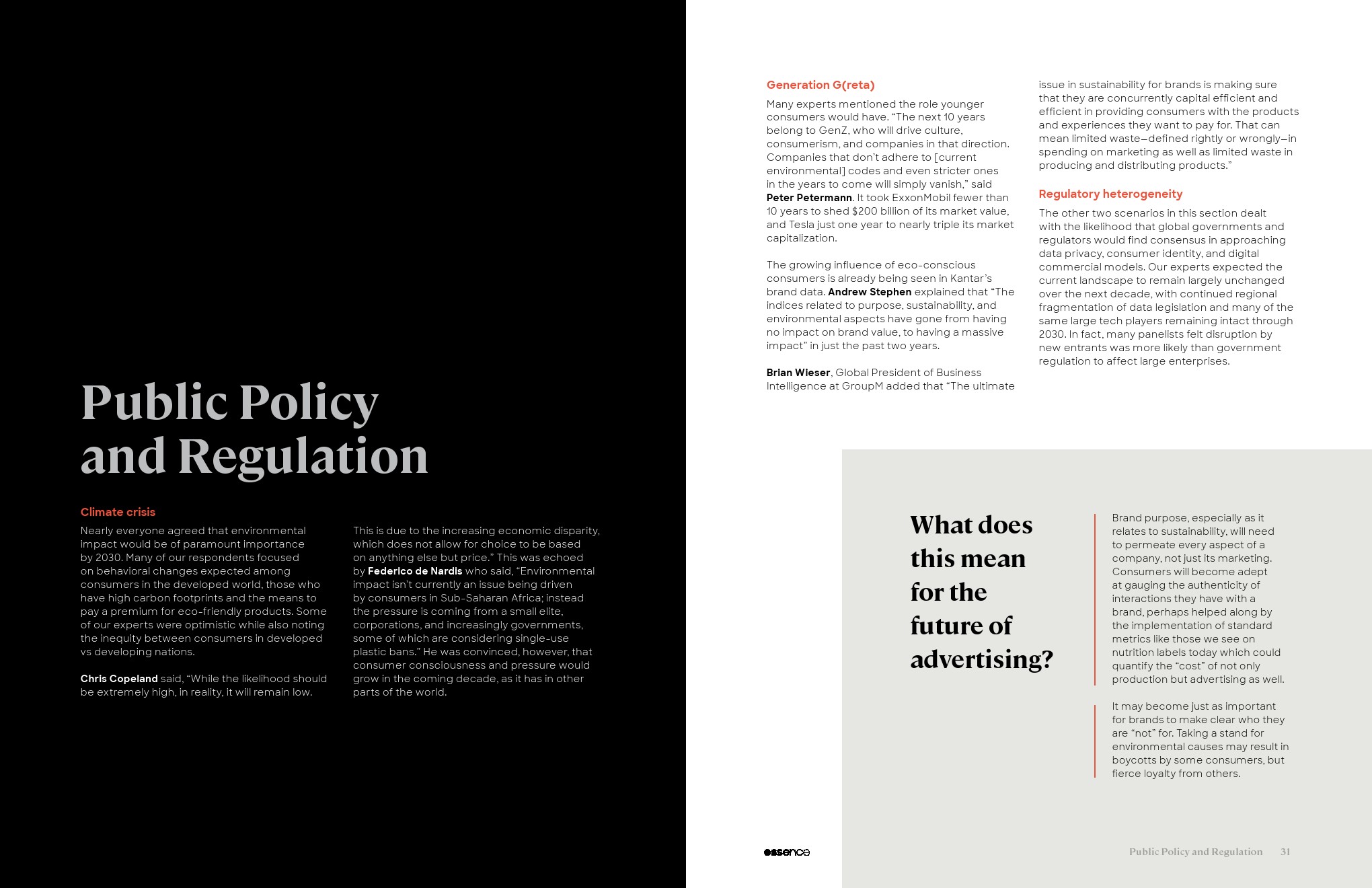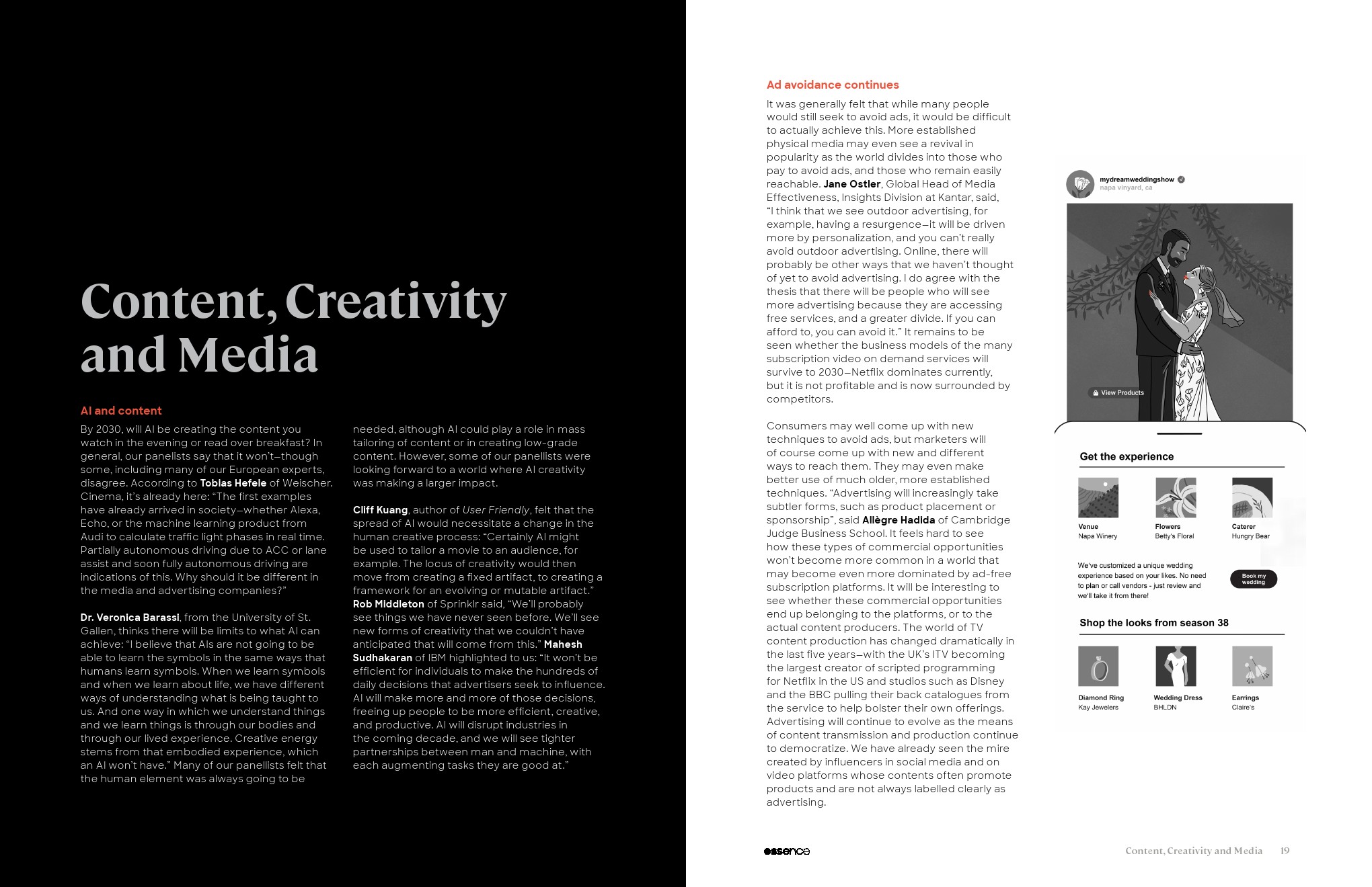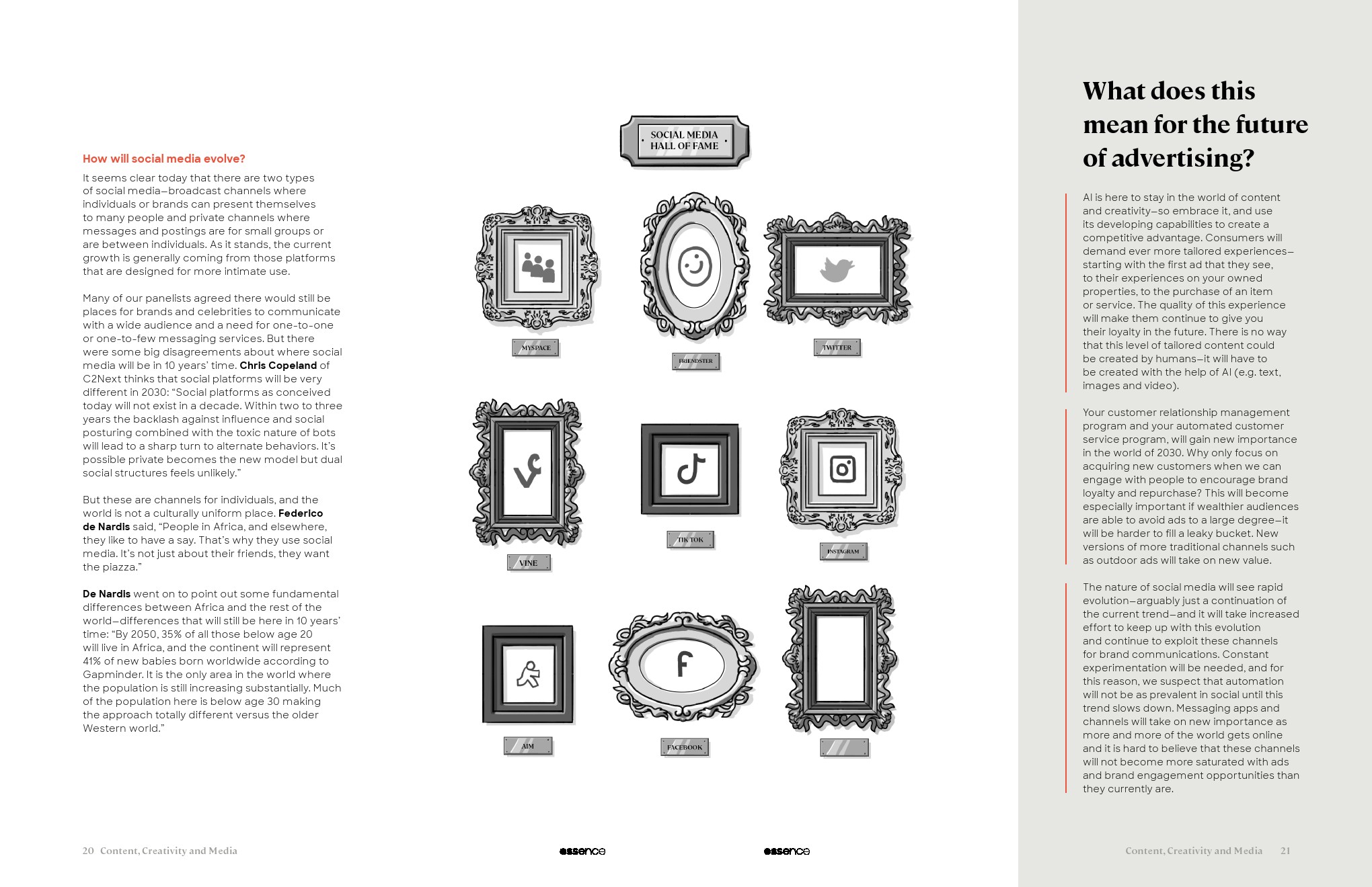 - 广告将继续为消费者提供内容和服务,特别是在发展中国家,但专家也预测,公司将开始在营销中优先考虑服务,而不是产品。受访者认为,人们不太可能完全选择回避广告,而是倾向于植入产品和赞助等更微妙的营销形式,融入无摩擦的服务和体验。这些将发挥越来越重要的作用。