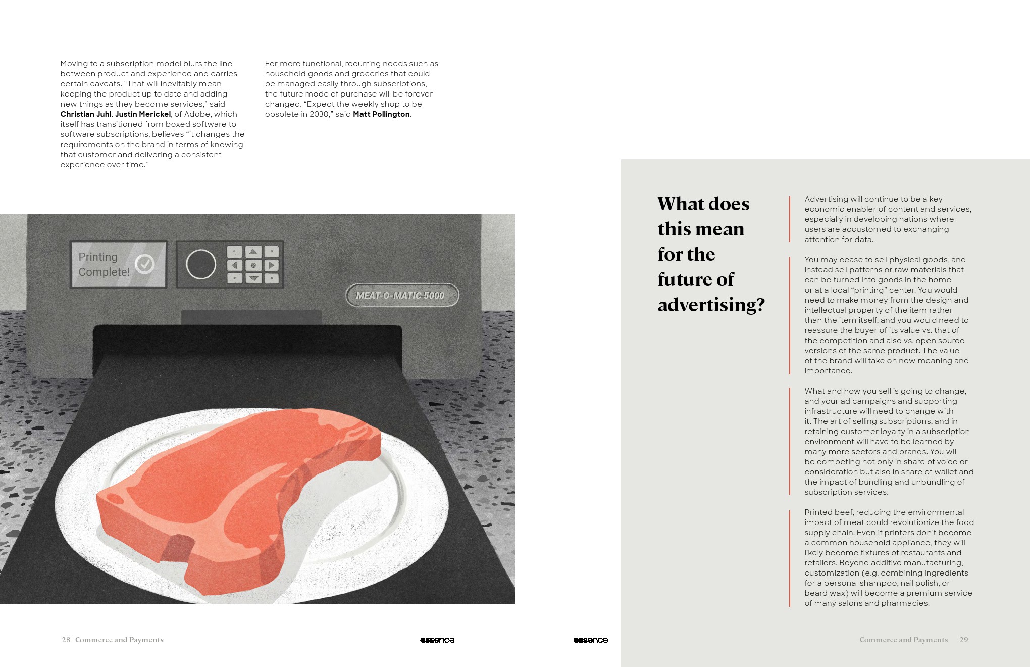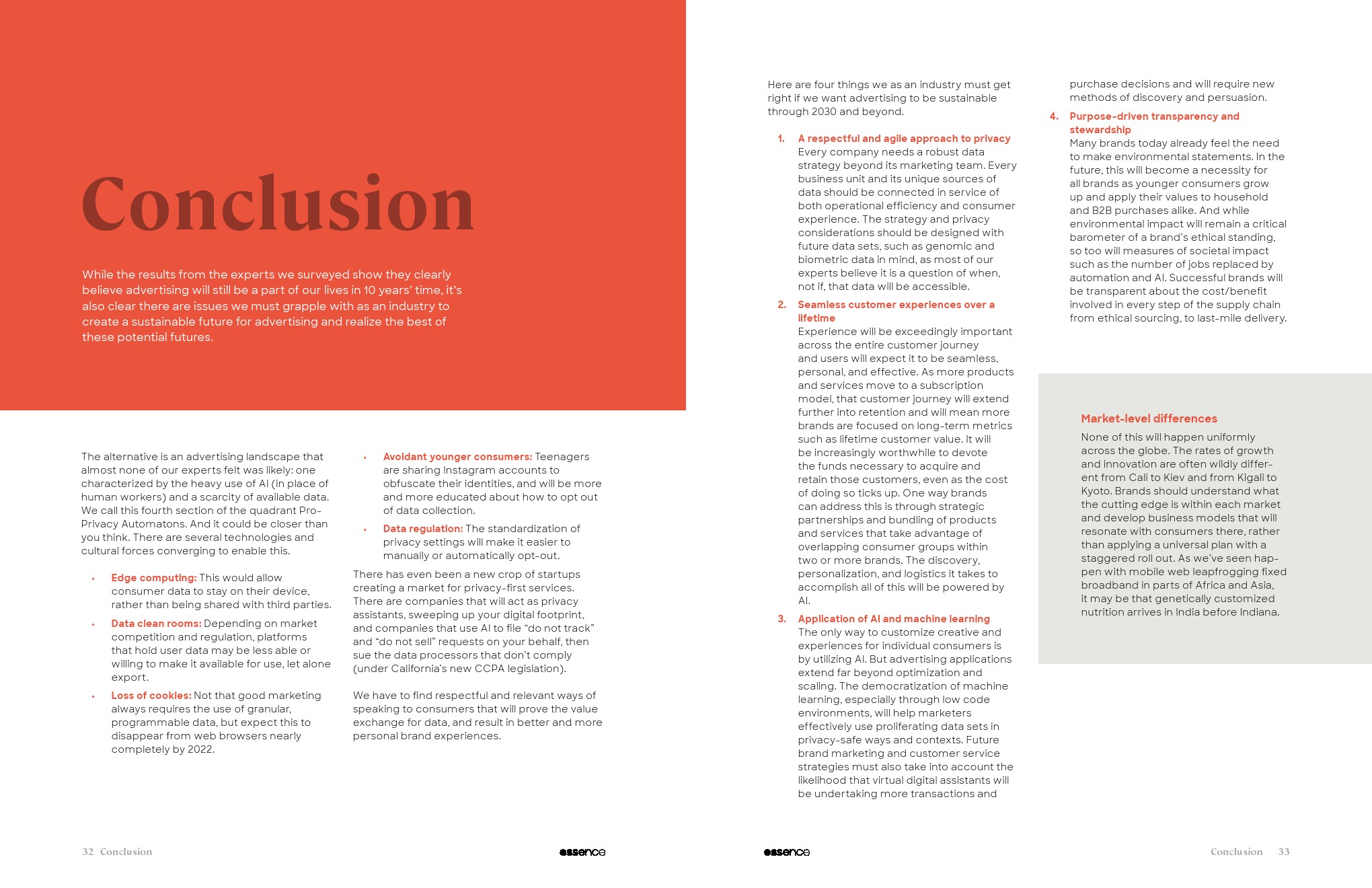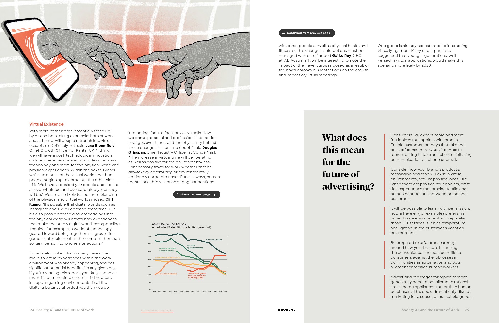 - 广告将继续为消费者提供内容和服务,特别是在发展中国家,但专家也预测,公司将开始在营销中优先考虑服务,而不是产品。受访者认为,人们不太可能完全选择回避广告,而是倾向于植入产品和赞助等更微妙的营销形式,融入无摩擦的服务和体验。这些将发挥越来越重要的作用。