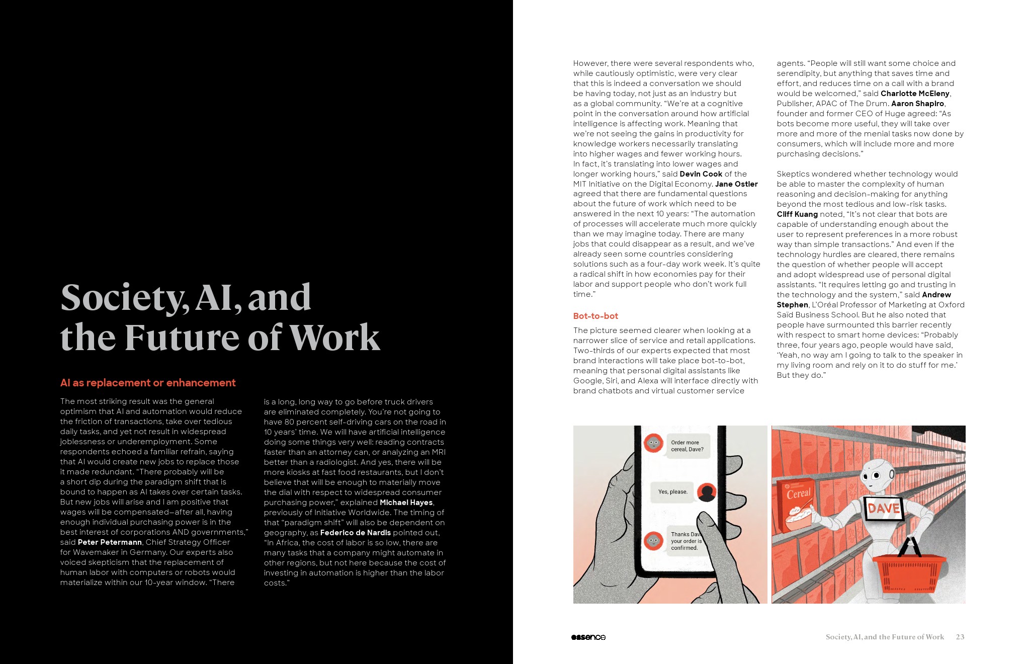 - 尽管专家乐观地认为,人工智能将在不创造广泛失业或消除对人的需求的情况下提高效率,但个人和公司需要创造新类型的就业机会,拥抱应用人类创造力的新领域。专家预计人工智能将对营销产生戏剧性影响的一个例子是预测消费者购买决策,机器将根据消费者的目标和偏好优化策略。