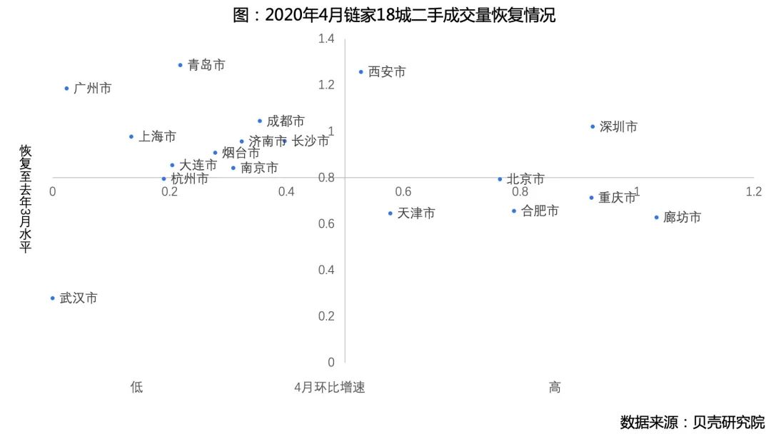 全国重点城市二手房市场改善需求加快入市,预计5月市场自然回落 疫情打乱了传统3月小阳春的节奏,小阳春滞后到4月,4月重点城市的二手房市场继续复苏,重点18城市链家成交量环比增加40%以上,改善型需求进场支撑4月的市场,市场成交量的大幅增长带动价格的止跌上涨。 从城市复苏差异、对比往年小阳春市场、周度细分数据来看,市场的复苏已经出现了拐点,核心原因在于前期受疫情影响的需求集中释放后,在政策保持稳定、疫情冲击收入和预期的情况下,市场的长期支撑力度不足。 从目前的市场预期和高意向潜在需求来看,5月的市场将会自然回落,2020年上半年的市场将明显弱于2019年同期。 01、改善性需求带动市场继续复苏,价格止跌上涨 随着各个城市复工复产的继续推进,房地产线下活动也持续恢复。4月全国重点城市二手房市场继续快速复苏,重点18城[1]链家二手房成交量继续增长,环比增加43.1%,同比增加17.6%,由于疫情推迟的购房需求开始在四月快速释放。 [1] 链家重点18城包括:北京、上海、深圳、广州、大连、天津、廊坊、西安、济南、青岛、烟台、武汉、南京、合肥、杭州、长沙、重庆、成都。 4月份改善性需求释放节奏加快。4月链家18城成交面积在90平以上占比高出2.2个百分比,达到30%。三居室的改善房源成交占比连续两个月提升,超过30%。从典型城市来看,北京4月二手房成交面积在90平以上占比较3月增加3.3个百分点、450万以上的改善房源成交占比大幅提升5个百分点。 需求的快速集中释放带动价格止跌上涨。4月重点17城[2]中有16个城市价格环比上涨,整体来看二手房价格上涨幅度不大,没有出现需求集中释放导致的房价快速大幅上涨情况。 [2] 武汉3月无成交,因此没有成交价格数据。 市场成交继续恢复并带动价格上涨的原因有几点: 第一,每年春季尤其是3月都有一波因为春节滞后的需求集中释放,从刚需轮动到换房改善需求,今年因为疫情影响这些需求有所延迟,集中在4月释放。短期成交量的快速增长带动短期市场情绪的升温和价格的上涨。 第二,LPR下降带来的市场预期松动。4月LPR下降了10个基点、是近几个月的最大降幅,对市场预期有较大的提振作用,一些城市也出台了人才落户等边际放松政策对市场预期也有一定的刺激作用。 02、市场拐点已经出现,后期支撑力度不足 虽然4月的市场在继续复苏,但恢复力度并不大,表现在以下几个方面: 第一, 4月交易量只有去年3月的85%。 第二,根据历史成交变化假设一季度缺失的需求延后到二季度释放,预计二季度的交易量同比增长可能达到40%,目前 4月的成交量同比增长17.6%,不及预期。 第三,从周度数据看,市场的拐点已经出现,目前的成交量已经连续下滑两周,市场拐点较为明显。 从单个城市层面来看,市场动力不足的特点更加明显:从4月成交量环比与4月成交量恢复绝对水平(4月对标的是去年3月,因此用4月成交量/2019年3月成交量)两个维度来看,可以将18个城市划分为四个类别(按照平均值划分为四个象限)。4月只有5个城市(广州、深圳、成都、西安、青岛)的成交量超过了去年3月,除了西安、深圳外,绝大部分的样本城市集中在二四象限,也就意味着“成交量恢复快的,不达去年同期水平;达到去年水平的,后期动力不足”,整体的动力可持续性并不强。 市场缺乏长期动力在于以下两个方面: 第一,疫情对于经济的影响已经开始显现,居民的收入受到冲击,且后期存在较大的不确定性。根据贝壳的交易数据,有5个城市的月供收入比(深圳、上海、南京、广州、杭州,收入用城镇居民可支配收入口径)超过50%,13个城市的月供收入比大于40%,居民的房贷负担压力大、收入敏感度高。 第二,目前的调控政策并没有转向,依旧保持高压态势。虽然LPR在逐步下降,但是这种下降都是保持首付比例稳定的前提下,收入约束和政策持续偏紧的背景下,需求端入市积极性不高。 03、5月成交量将会大概率下滑,价格走向平稳 虽然4月市场成交量有明显增长,但是长期收入不确定、调控政策不放松的背景下,市场支撑力度不足、市场节奏依旧较缓。从调价行为来看,4月18个城市中有13个城市涨价占比下降,比上个月增加了6个城市。深圳的调涨占比虽然较高,但是在金融政策调整后,业主预期也相应回落,调价中涨价占比下降。成交周期方面,4月客户成交周期拉长到56.8天,较去年同期增加13天,18个城市房源成交周期均超过120天,市场成交节奏依旧缓慢。 从需求端来看,如果将目前链家的客源按照线下看房频率选取出高潜客源,历史数据显示当月高潜客源量和下个月成交量在各个城市间有稳定的比例关系。选取体量大的典型重点城市来看,按照对应的转化比率测算,北京、成都、大连、上海、深圳5月成交量环比4月分别下滑19%、增长4%、下滑11%、下滑23%、下滑9%,预计5月大部分城市的成交量都会出现拐点,开始自然回落。 来自: 贝壳研究院 更多阅读:58安居客房产研究院:2022年11月全国二手房市场月报58安居客:2022年6月全国二手房市场贝壳:2022上半年二手房市场中国人民银行:2019年第一季度城镇储户问卷调查报告中国统计局:2018年1-8月份全国规模以上工业企业利润增长16.2%商务部:2017年全年全国吸收外资情况国家统计局:2022年9月中国采购经理指数运行情况国家统计局:2024年5月份工业生产者出厂价格同比降幅明显收窄 环比上涨51%的华为员