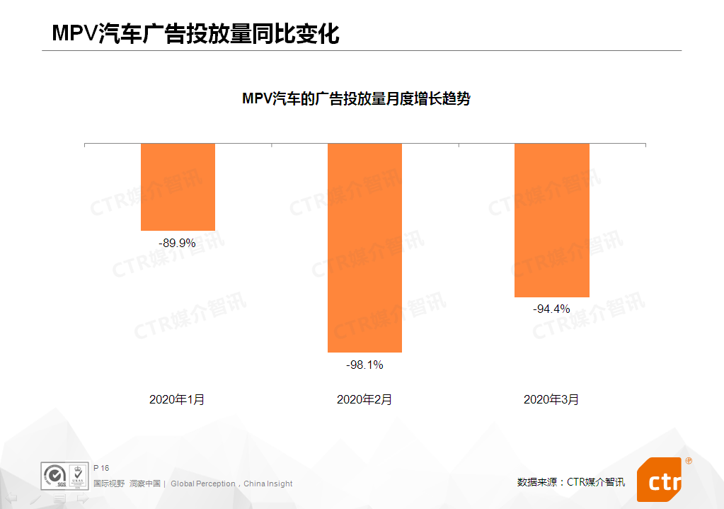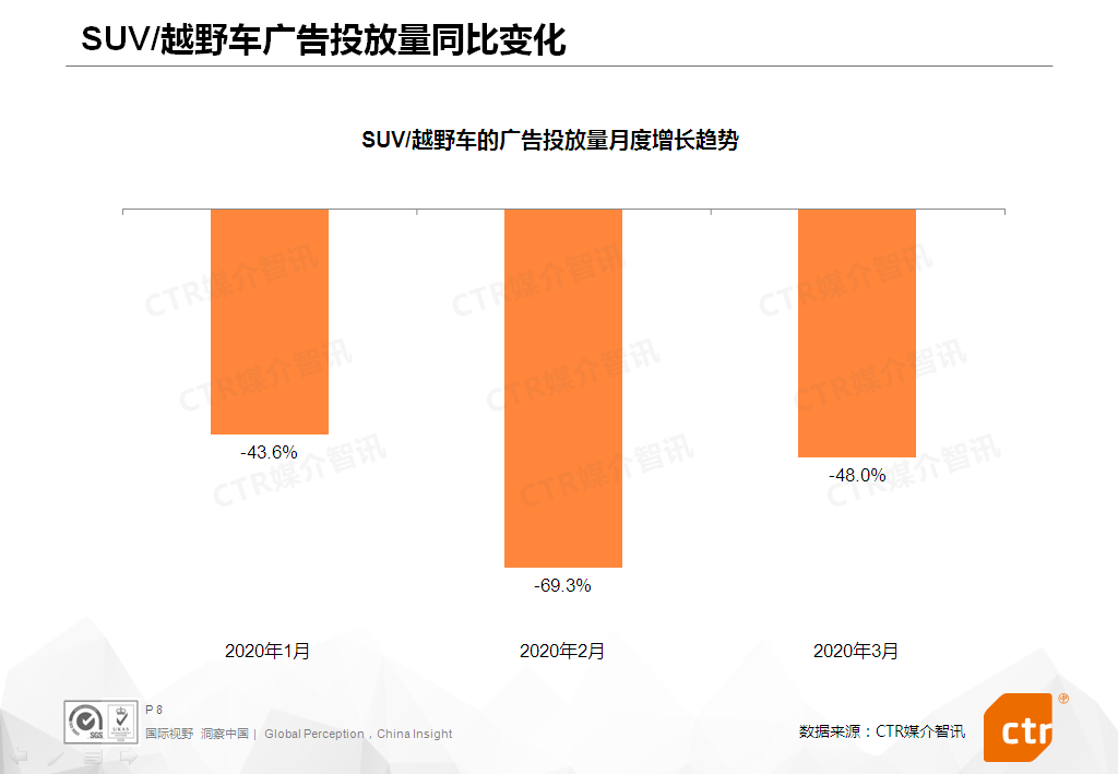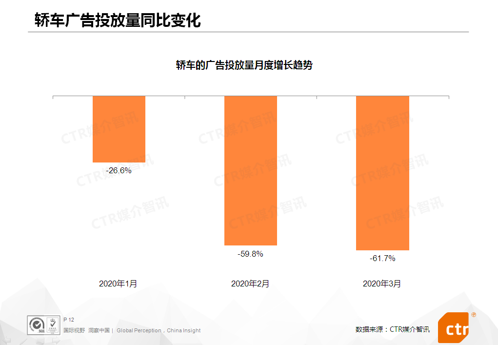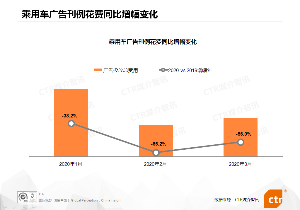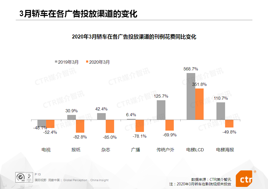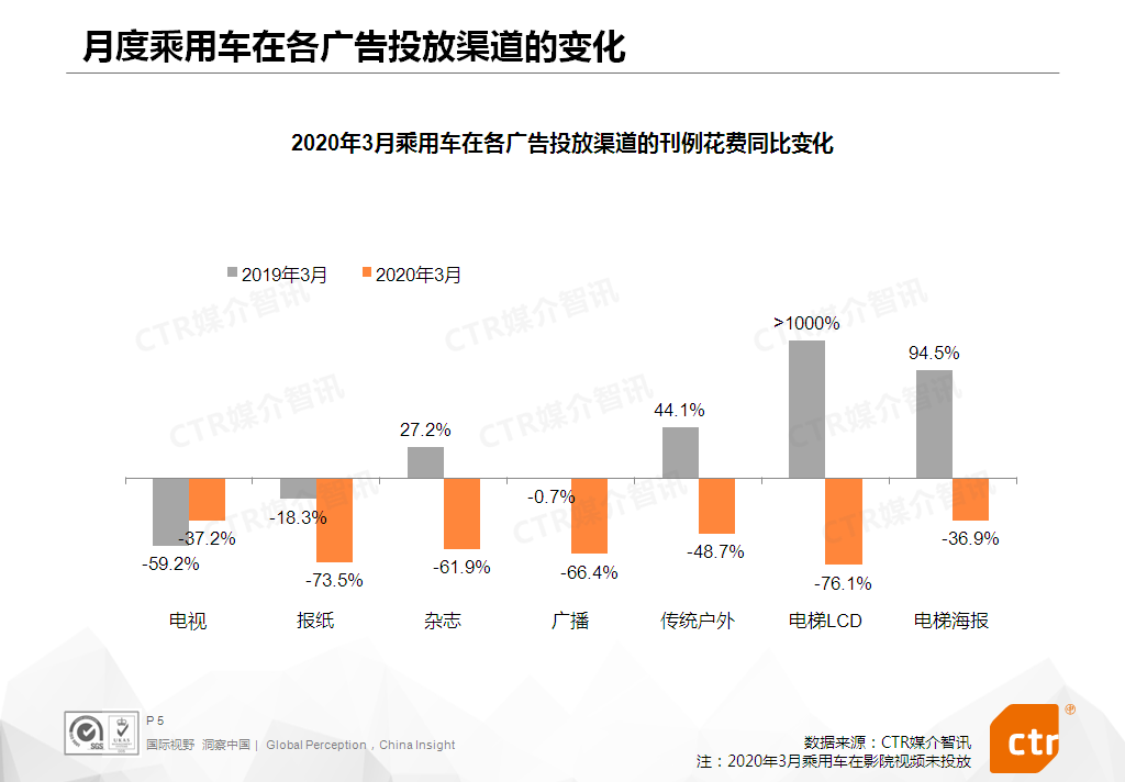 2020年3月,乘用车行业继续受到疫情影响,广告投放刊例花费同比下滑56.0%,但与2月相比,降幅收窄了10个百分点。