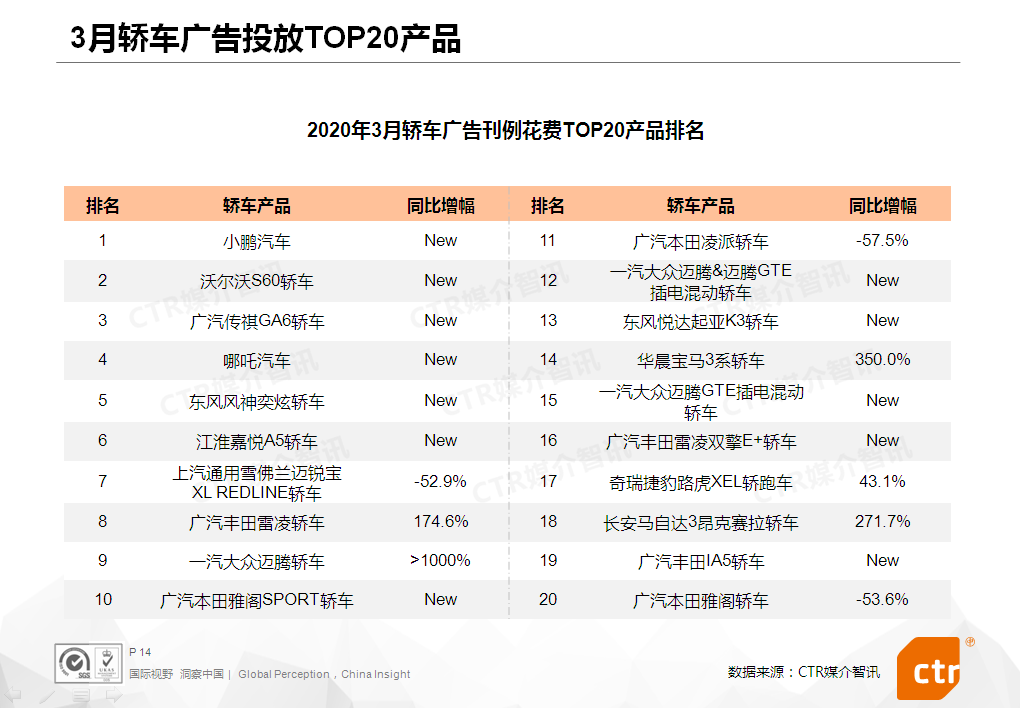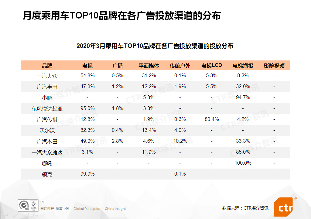 乘用车TOP10品牌中,排名前两位的一汽大众和广汽丰田虽然覆盖六大广告渠道,但在电视的投放比重均达45%以上;领克自2月上榜以来,一直专注电视广告投放,主力推广领克01SUV和领克03轿车;浙江合众新能源汽车有限公司旗下的哪吒汽车新入榜,集中在电梯海报投放广告,以配合3月下旬上市的紧凑型纯电SUV-哪吒U造势。