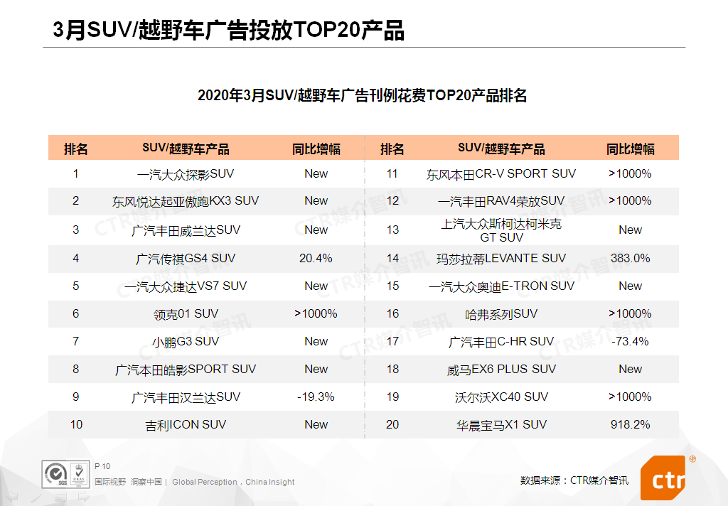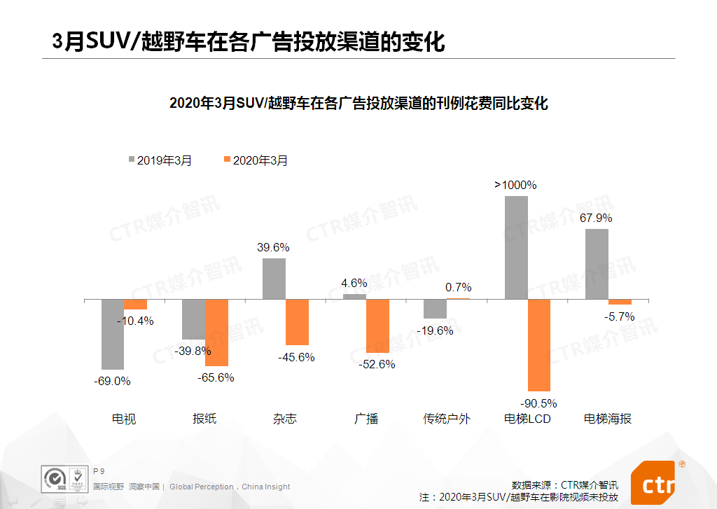 SUV/越野车 – 3月份SUV/越野车刊例花费同比跌幅缩减至48.0%。该品类的投放在各大广告渠道继续呈现不同程度的下滑,电视、平面、广播、电梯LCD的降幅均达两位数。TOP20产品榜单内,半数产品是新上榜。