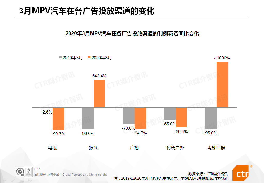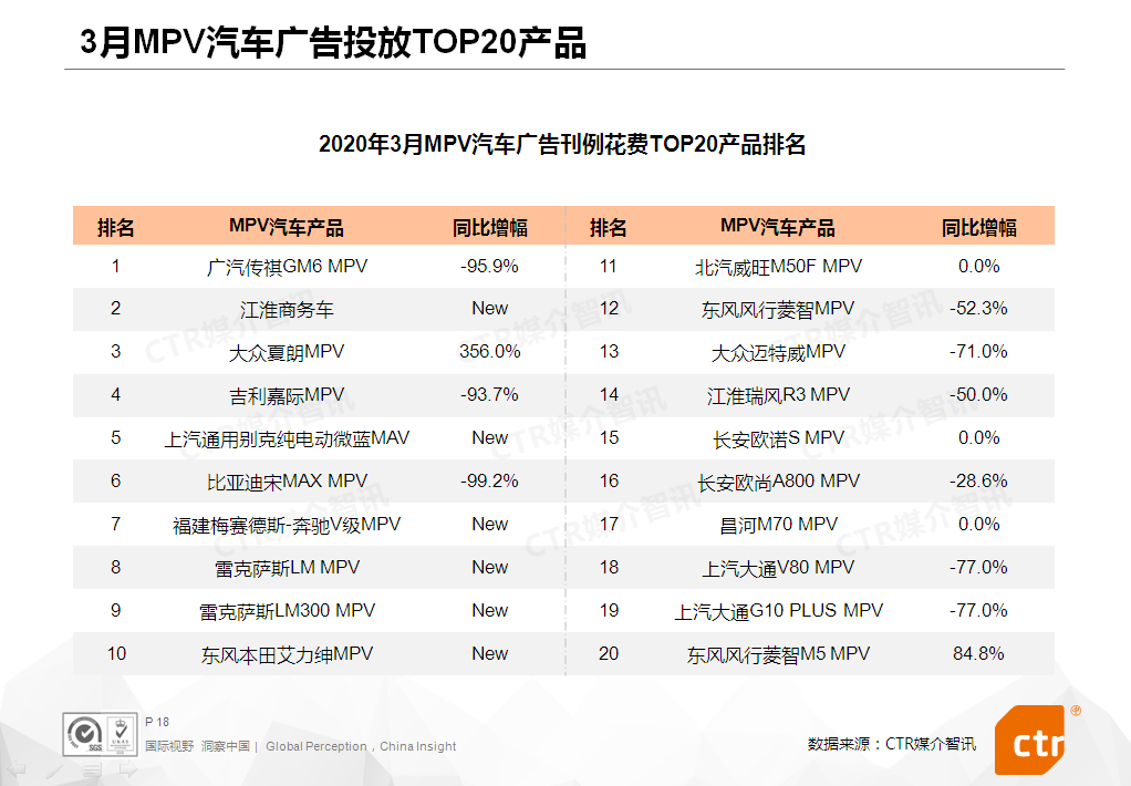MPV汽车 – 3月份MPV汽车广告投放刊例花费同比跌幅微缩4个百分点。该品类在报纸的同比增幅达642.4%,主要由福建梅赛德斯-奔驰、雷克萨斯和江淮三大品牌拉动;MPV汽车在电梯海报的投放同比增幅更超过1000%,以广汽传祺GM6 MPV和大众夏朗MPV在电梯海报投放的刊例花费最多。TOP20产品榜单中,三成产品是新上榜。