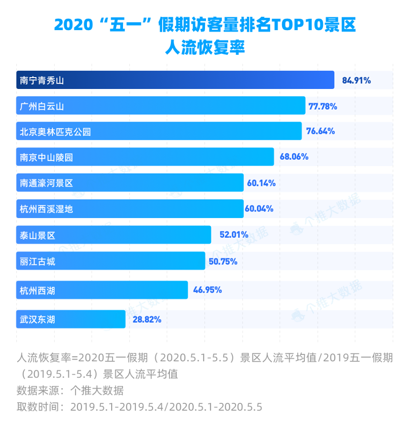 数据显示,2020“五一”假期访客量前十的景区中,有8个景点人流恢复率超过50%。其中,近期刚刚恢复开放夜游项目的南宁青秀山景区恢复情况最好,相比2019年“五一”假期,人流恢复率达到84.91%。湖北省于4月底开始恢复旅游业,“五一”假期武汉东湖景区的人流恢复率已达到28.82%,正逐渐回暖。
