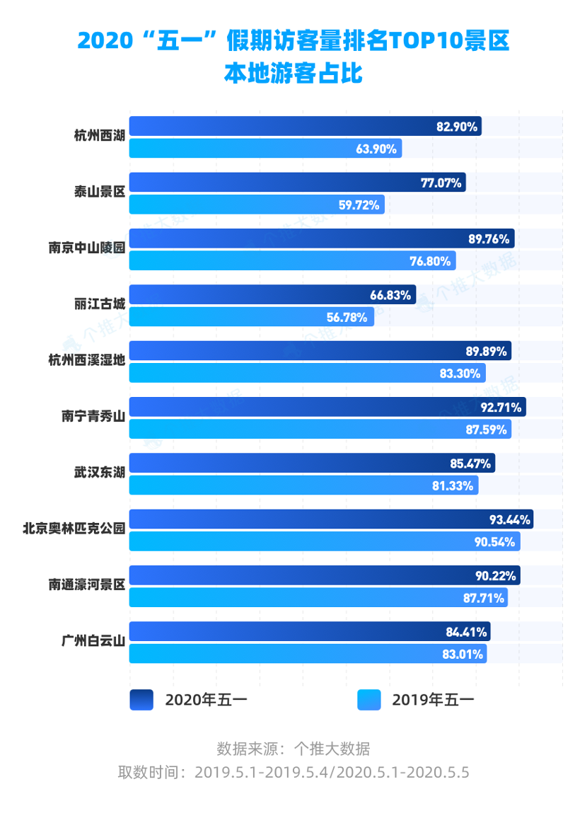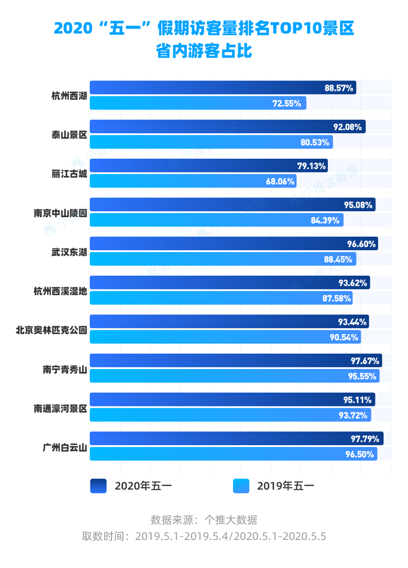 从各景区省内游客的占比来看,2020“五一”假期访客量前十的景区中,省内游客的占比相比2019年同期也均有提升,其中杭州西湖省内游客占比从2019年的72.55%提升至2020年的88.57%,上升16.02%,排名第一;泰山景区省内游客占比从2019年的80.53%提升至2020年的92.08%,上升11.55%,排名第二;丽江古城省内游客占比从2019年的68.06%提升至2020年的79.13%,上升11.07%,排名第三。