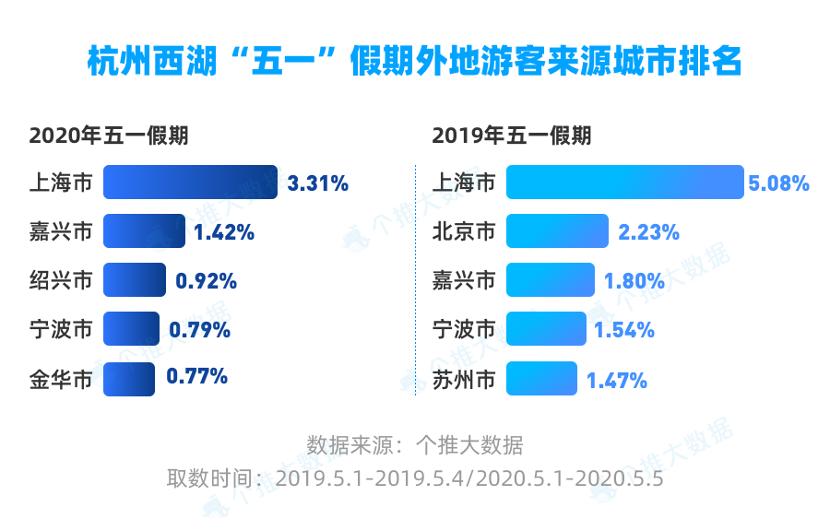 每日互动个推大数据进一步分析了2019年和2020年杭州西湖的外地游客分布情况。2020年“五一”假期杭州西湖景区到访游客来源地分布中,排名前五的外地城市与杭州的自驾车程均在2.5小时以内,且除了上海外,其余均为省内城市。而2019年“五一”假期入围前五的城市中,省外城市所占席位更多,包括上海、北京、苏州。由此可见,在倡导安全出行、自驾出行的背景下,更多人愿意选择轻松的短途游和省内游来度过假期。