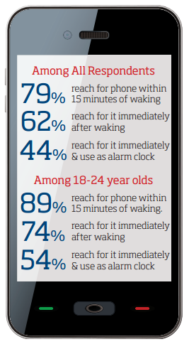 根据Facebook和市场研究机构IDC的联手进行的一项最新调查显示,在18-24岁年龄段的智能手机用户中,89%的人在醒来后15分钟内会查看手机,74%的人是醒来后马上查看。IDC此次调查选取了7466位美国iPhone和安卓手机用户,年龄在18-44岁之间。