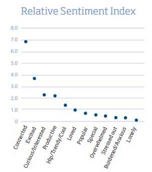 研究表明,人们使用智能手机的主要原因来自于跟他人连通的渴望。我们都希望和他人沟通,需要一种相互关联的感觉。当受访者被问到使用手机进行社交活动的感觉怎样时,从上面的情绪指数表可用看出,“连通”是最大的感受(情绪指数6.9),其次是兴奋,好奇。
