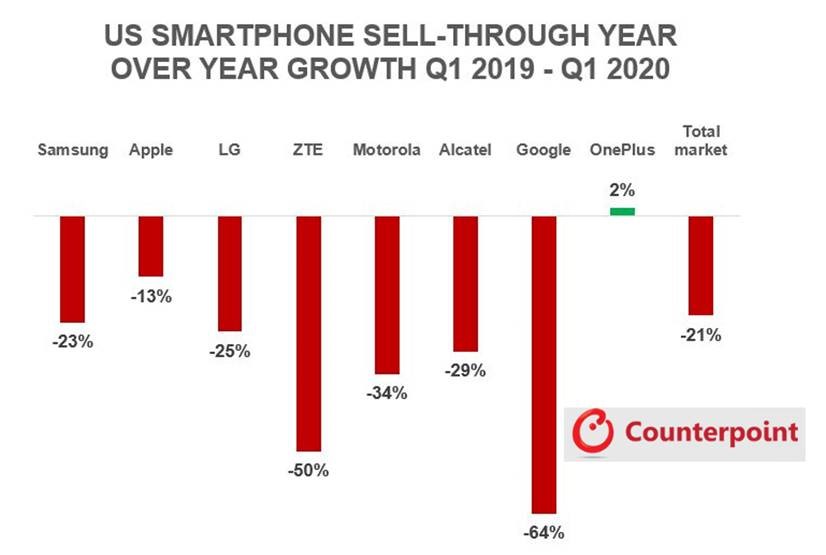Counterpoint 2020年第一季度美国渠道份额跟踪的最新研究显示,受店铺关闭和居家令影响,美国智能手机销量同比下滑21%。